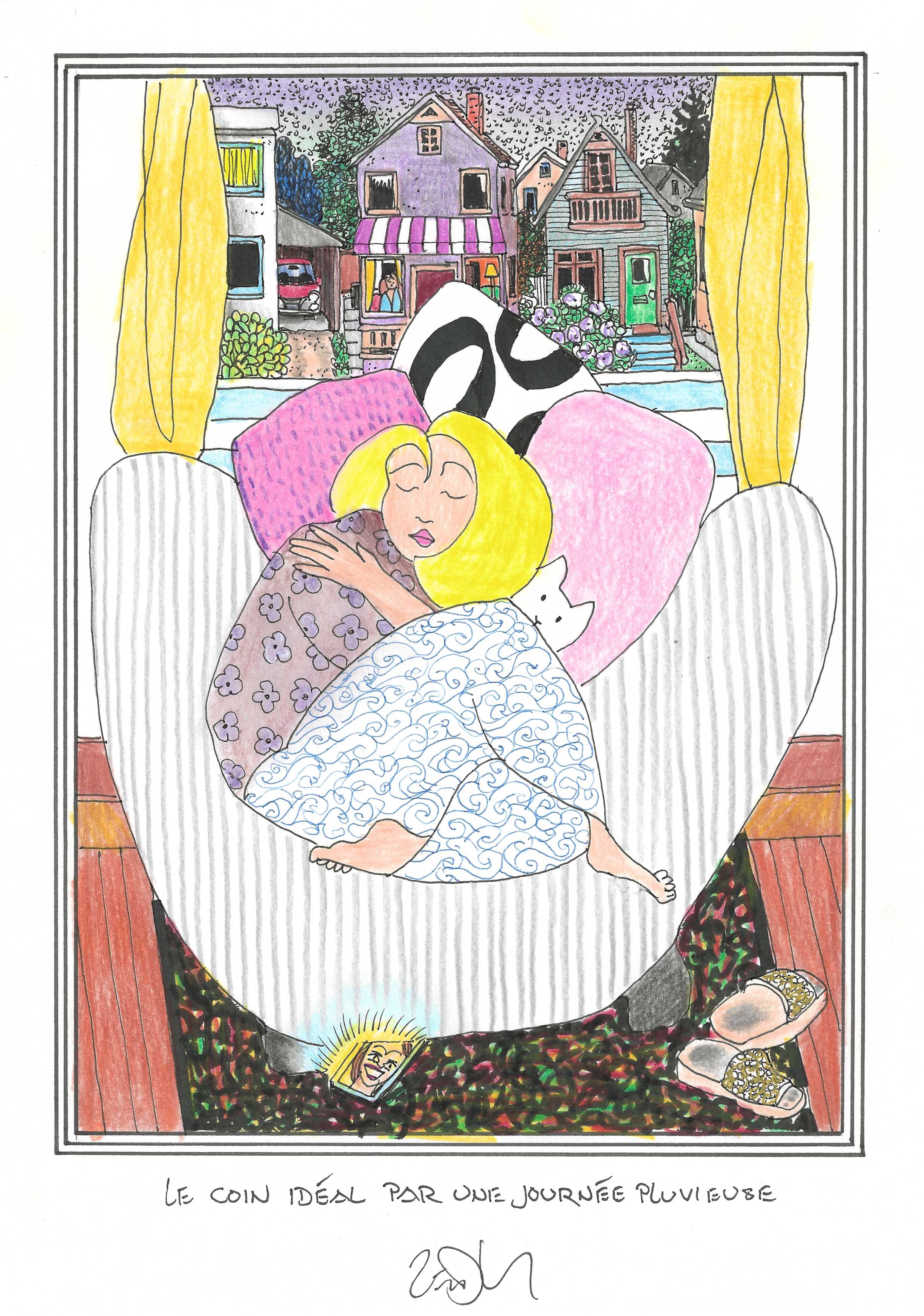 Drawing of the Day – 3349 – Dessin du jour « Best spot on a rainy day – Le coin idéal par une journée pluvieuse » Ink & colour on Paper – 8 x 12″ (21 x 30 cm) – Encre & couleurs sur Papier