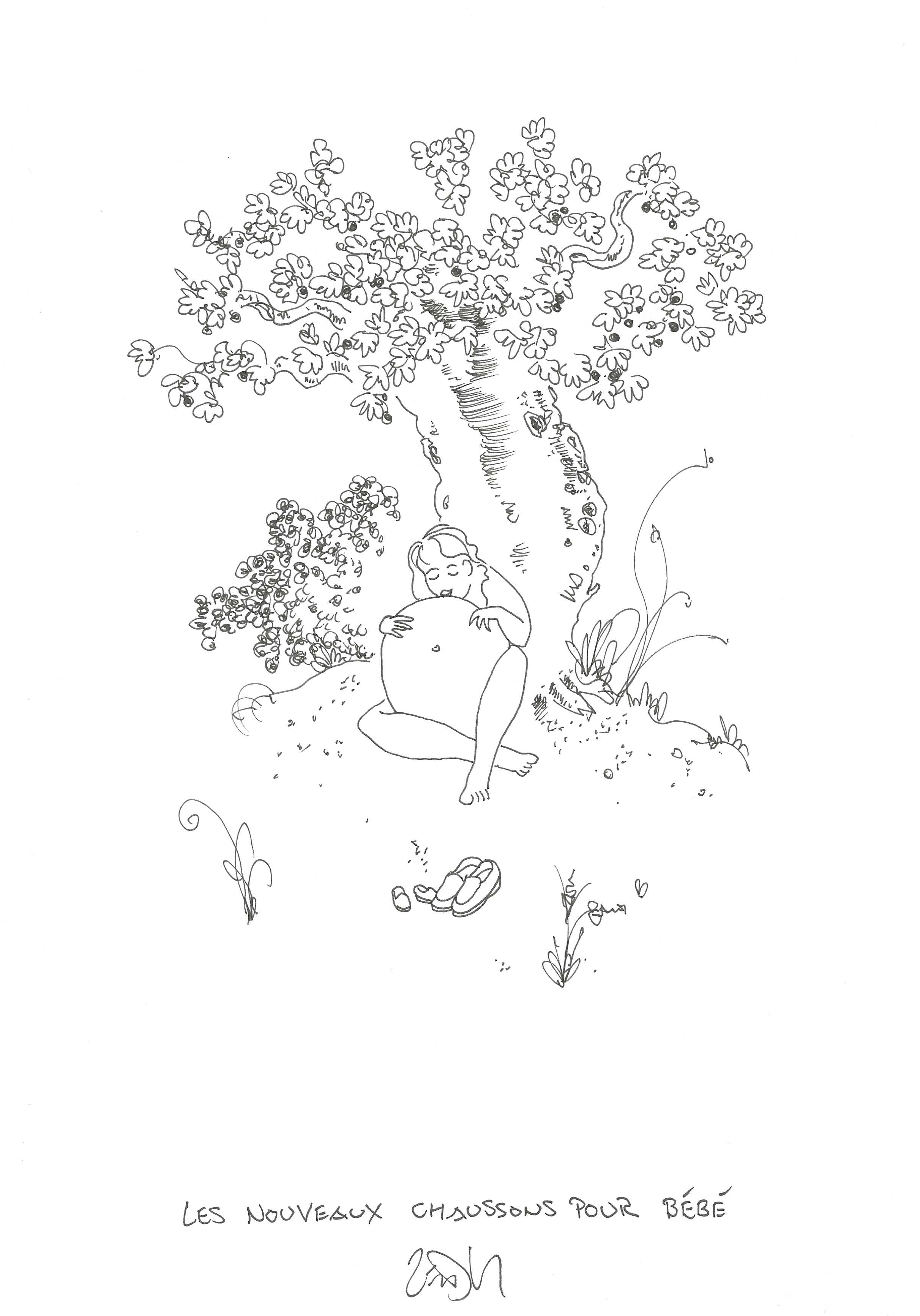 Drawing of the Day – 3350 – Dessin du jour « New baby shoes – Les nouveaux chaussons pour bébé » Ink on Paper – 8 x 12″ (21 x 30 cm) – Encre sur Papier