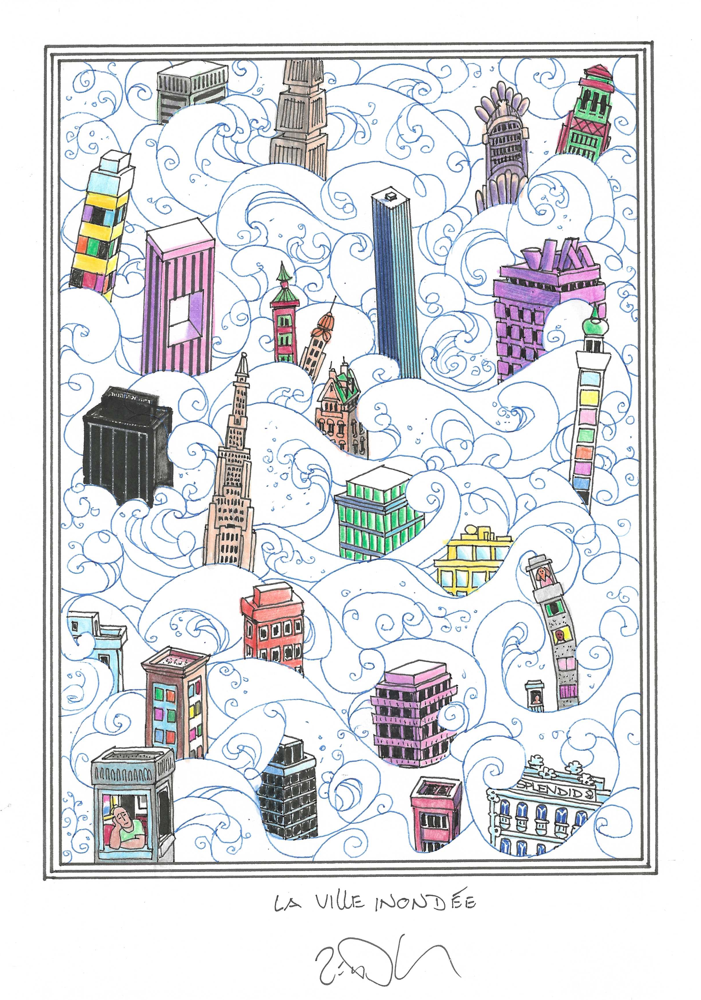 Drawing of the Day – 3351 – Dessin du jour « City in flood – La ville inondée » Ink & colour on Paper – 8 x 12″ (21 x 30 cm) – Encre & couleurs sur Papier