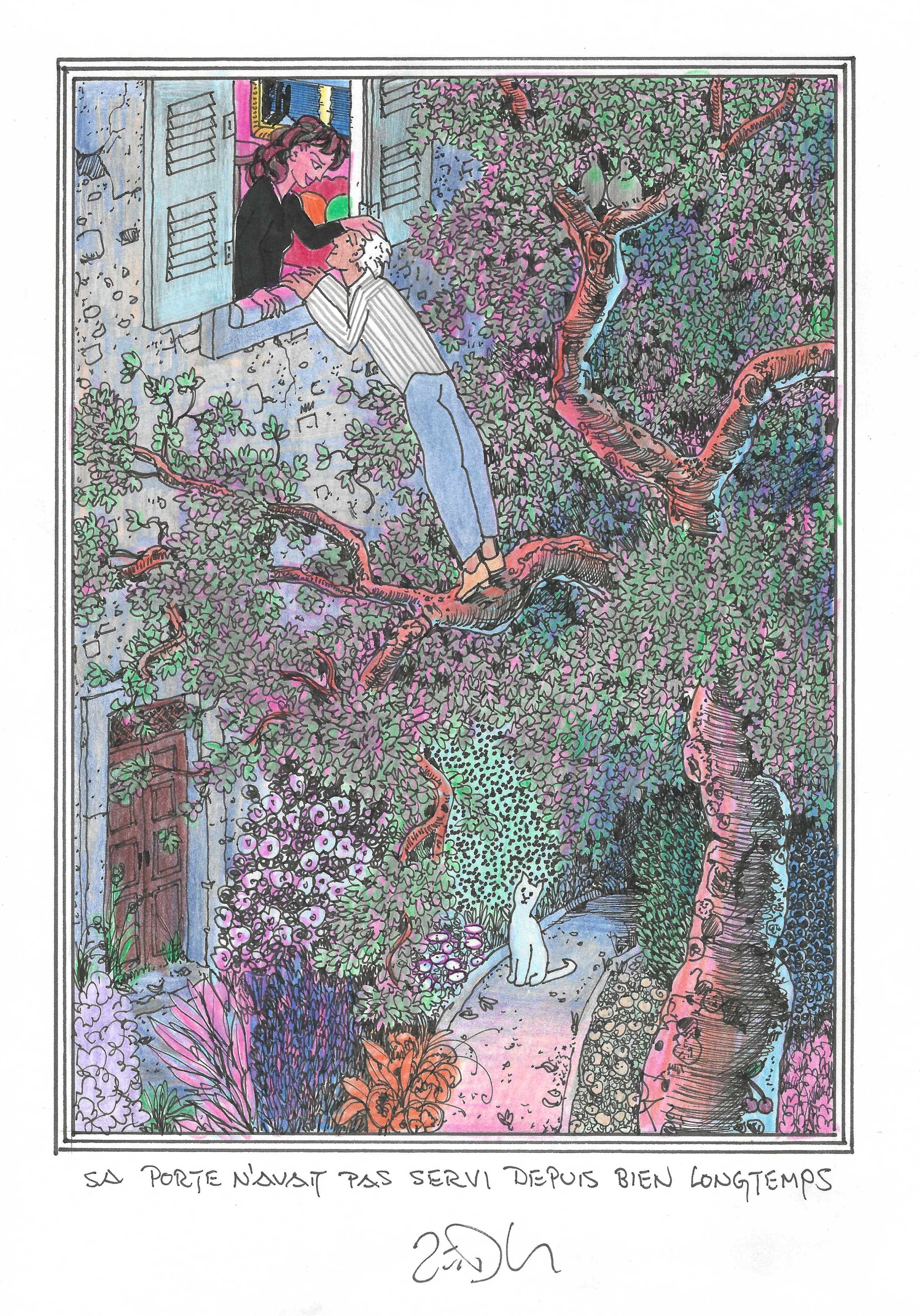 Drawing of the Day – 3352 – Dessin du jour « Her door had been unused for a long time – Sa porte n’avait pas servi depuis bien longtemps » Ink & colour on Paper – 8 x 12″ (21 x 30 cm) – Encre & couleurs sur Papier