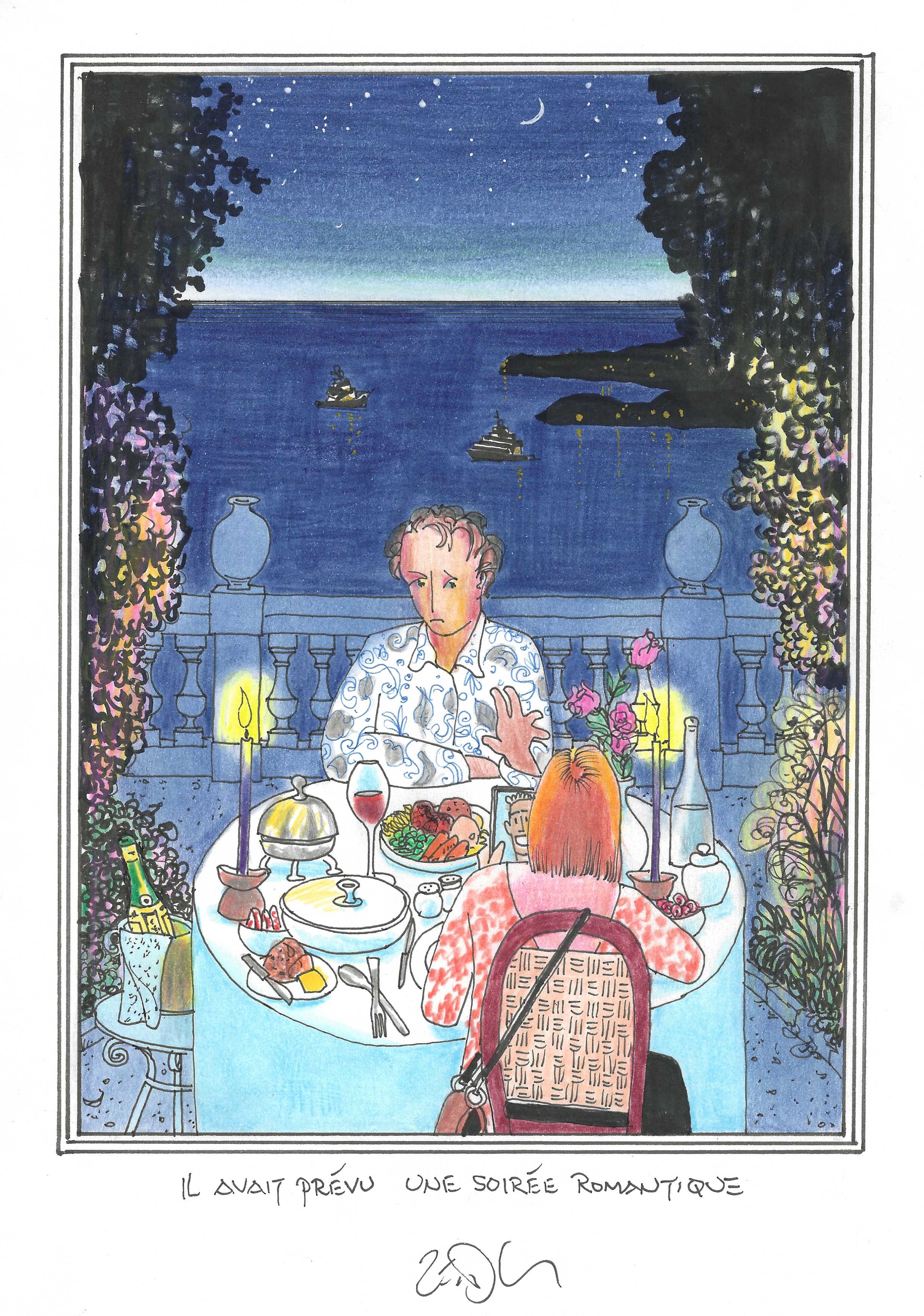 Drawing of the Day – 3353 – Dessin du jour « It was supposed to be a romantic evening – Il avait prévu une soirée romantique » Ink & colour on Paper – 8 x 12″ (21 x 30 cm) – Encre & couleurs sur Papier