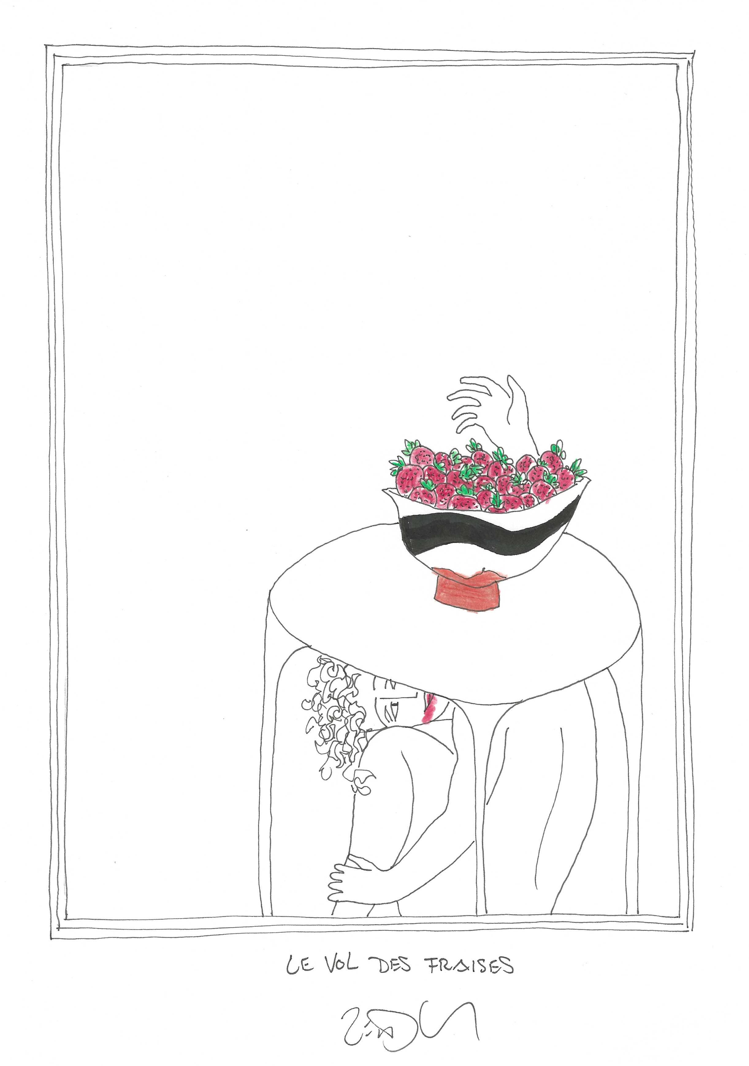 Drawing of the Day – 3354 – Dessin du jour « Stealing strawberries – Le vol des fraises » Ink & colour on Paper – 8 x 12″ (21 x 30 cm) – Encre & couleurs sur Papier