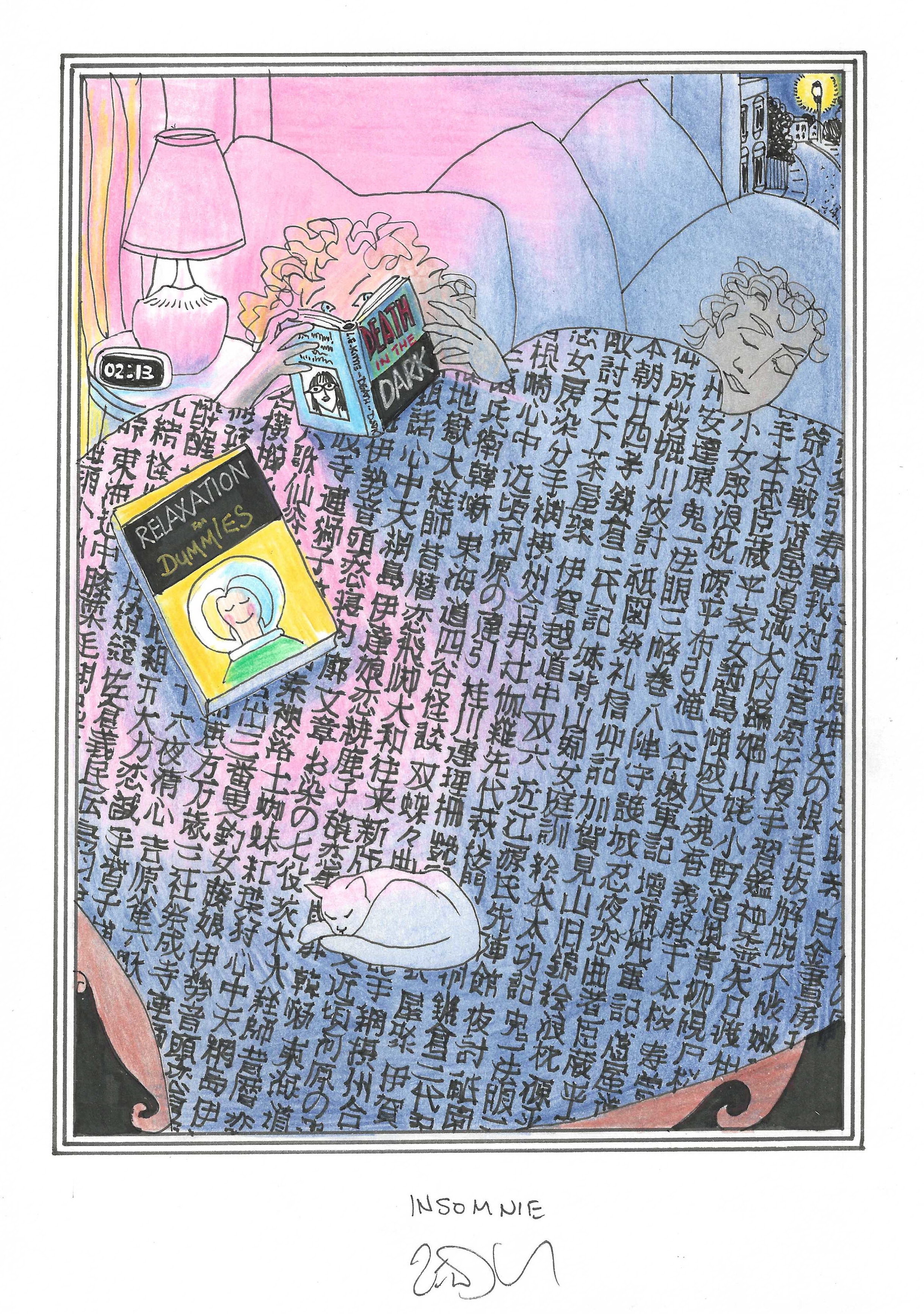 Drawing of the Day – 3335 – Dessin du jour « Can’t sleep – Insomnie » Ink & colour on Paper – 8 x 12″ (21 x 30 cm) – Encre & couleurs sur Papier