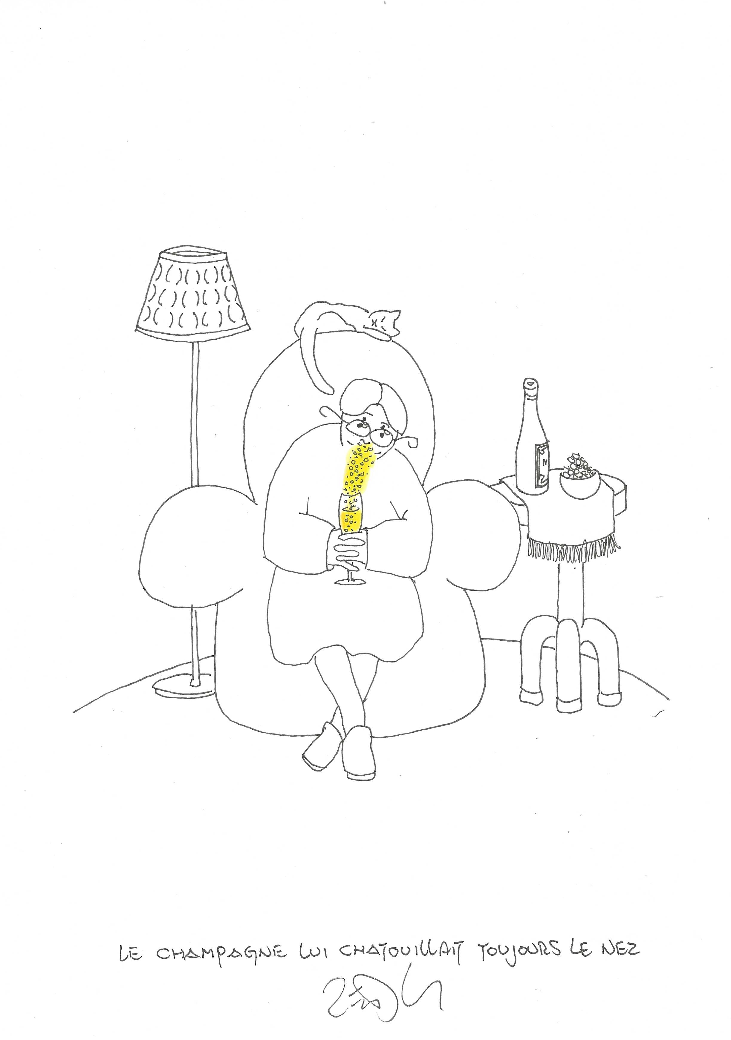Drawing of the Day – 3336 – Dessin du jour « The champagne always tickled her nose – Le champagne lui chatouillarit toujours le nez » Ink & colour on Paper – 8 x 12″ (21 x 30 cm) – Encre & couleurs sur Papier
