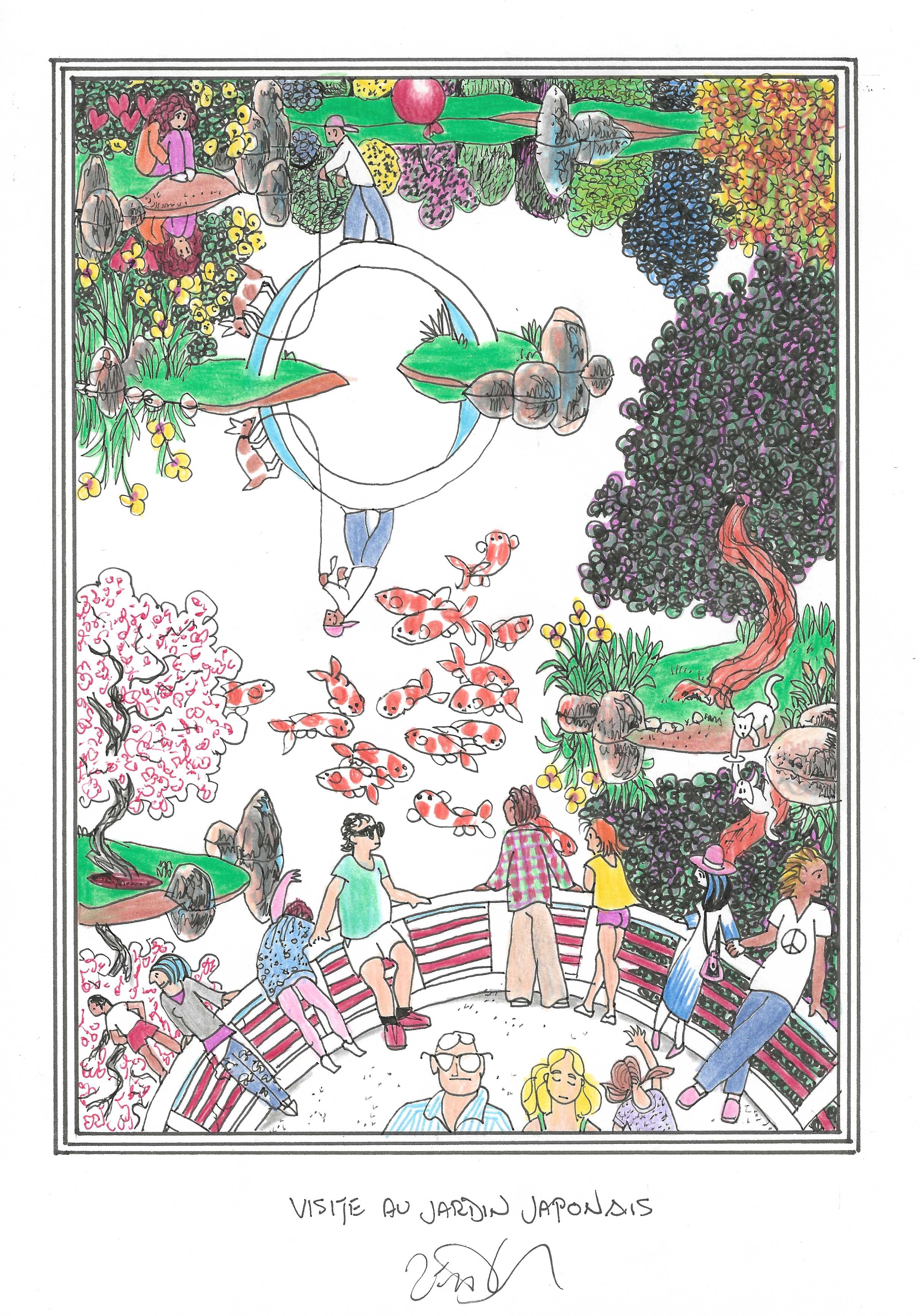 Drawing of the Day – 3337 – Dessin du jour « Visit to a Japanese garden – Visite au jardin japonais » Ink & colour on Paper – 8 x 12″ (21 x 30 cm) – Encre & couleurs sur Papier
