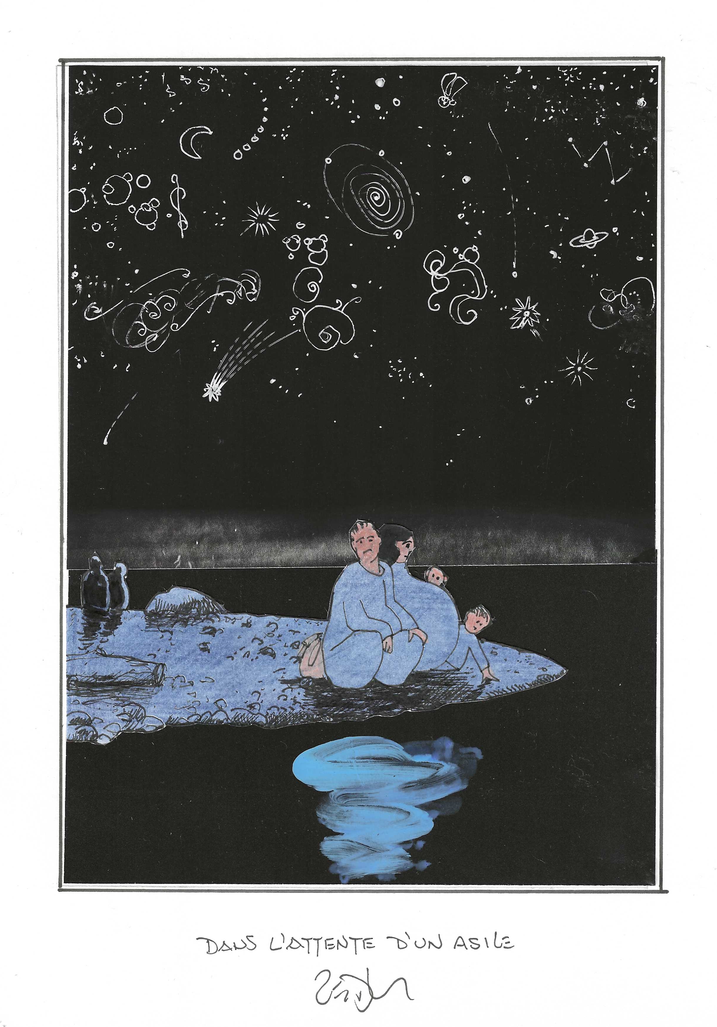 Drawing of the Day – 3338 – Dessin du jour « Waiting for asylum – Dans l’attente d’un asile » Mixed Media on Paper – 8 x 12″ (21 x 30 cm) – Technique mixte sur Papier