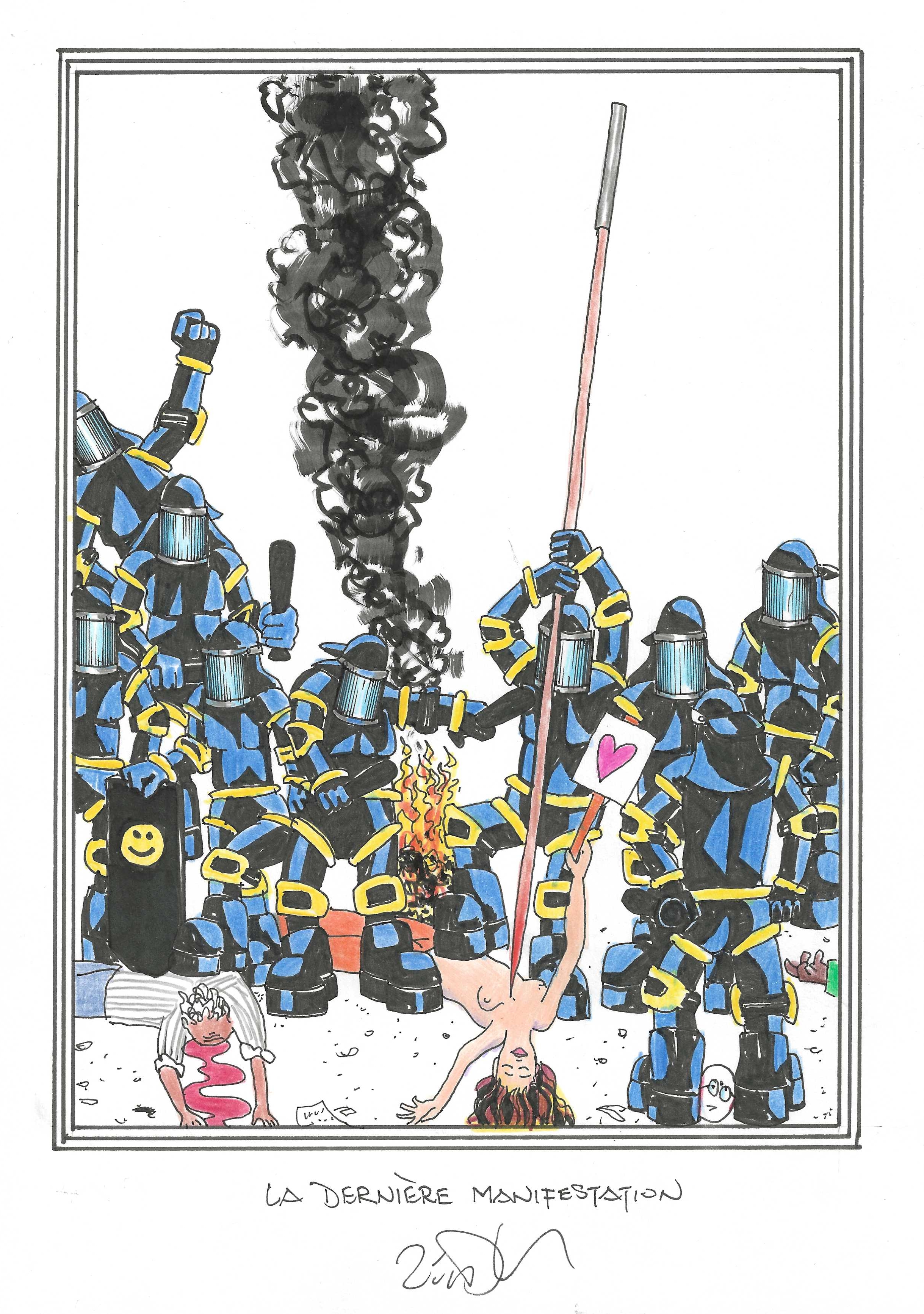 Drawing of the Day – 3340 – Dessin du jour « The last protest – La dernière manifestation » Ink & colour on Paper – 8 x 12″ (21 x 30 cm) – Encre & couleurs sur Papier