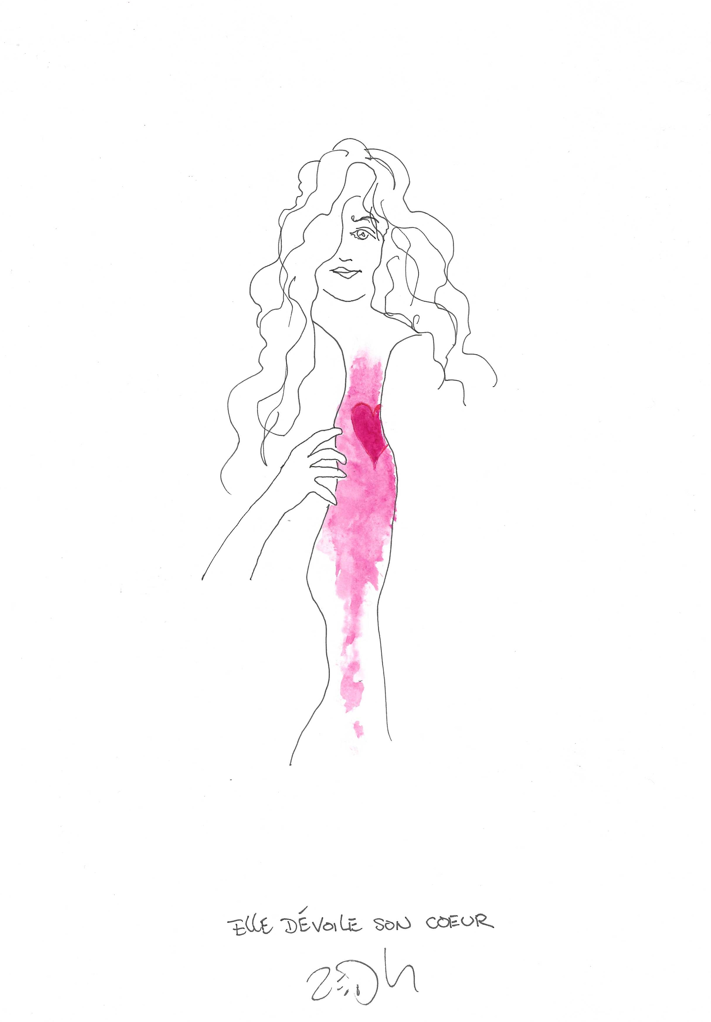 Drawing of the Day – 3341 – Dessin du jour « She uncovers her heart – Elle dévoile son cœur » Ink & watercolour on Paper – 8 x 12″ (21 x 30 cm) – Encre & aquarelle sur Papier