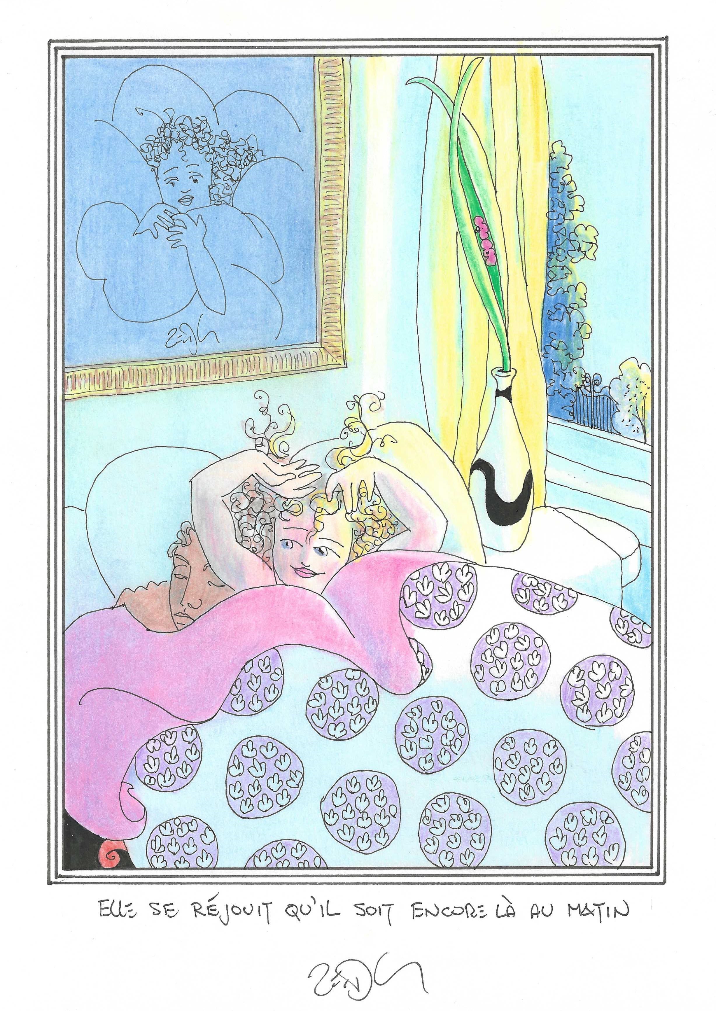 Drawing of the Day – 3342 – Dessin du jour « So glad he was still here in the morning – Elle se réjouit qu’il soit encore là au matin » Ink & colour on Paper – 8 x 12″ (21 x 30 cm) – Encre & couleurs sur Papier