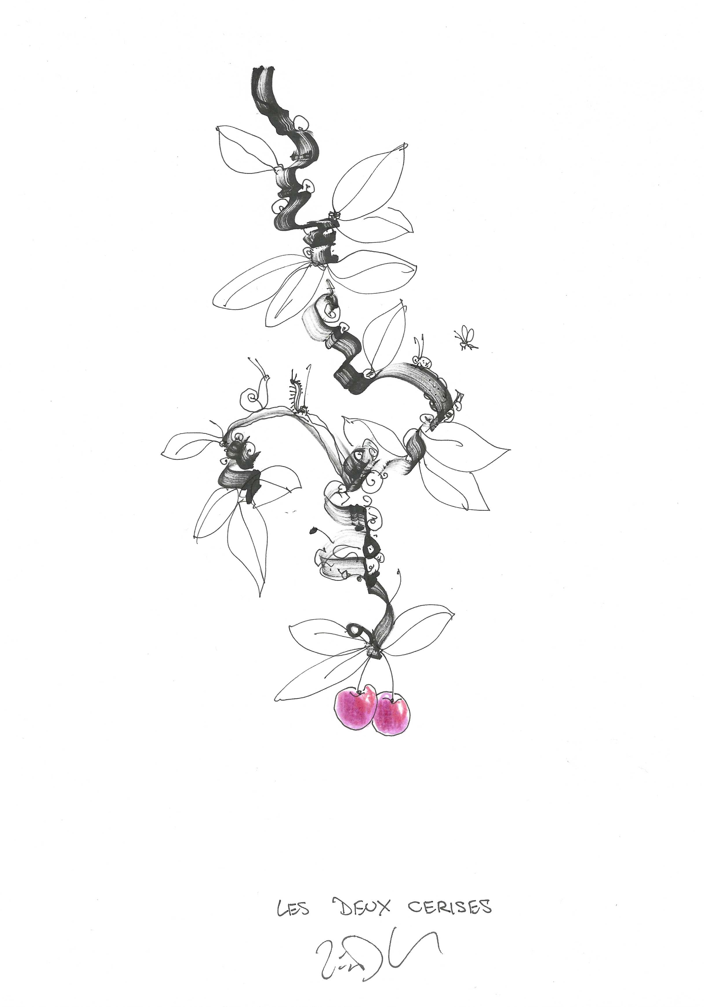 Drawing of the Day – 3344 – Dessin du jour « The two cherries – Les deux cerises » Ink & colour on Paper – 8 x 12″ (21 x 30 cm) – Encre & couleurs sur Papier