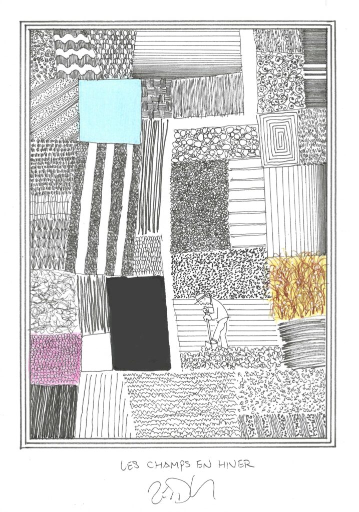 Drawing of the Day – 3723 – Dessin du Jour « Winter fields – Les champs en hiver » Ink & colour on Paper – 8 x 12″ (21 x 30 cm) – Encre & couleurs sur Papier