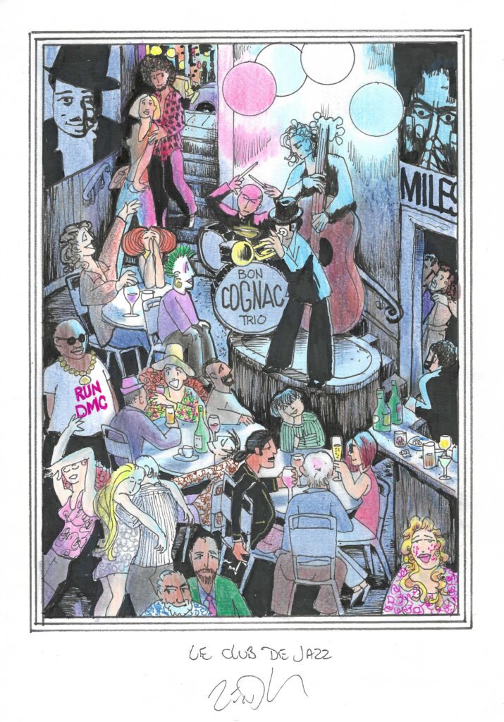 Drawing of the Day – 3727 – Dessin du Jour « Jazz club – Le club de jazz » Ink & colour on Paper – 8 x 12″ (21 x 30 cm) – Encre & couleurs sur Papier
