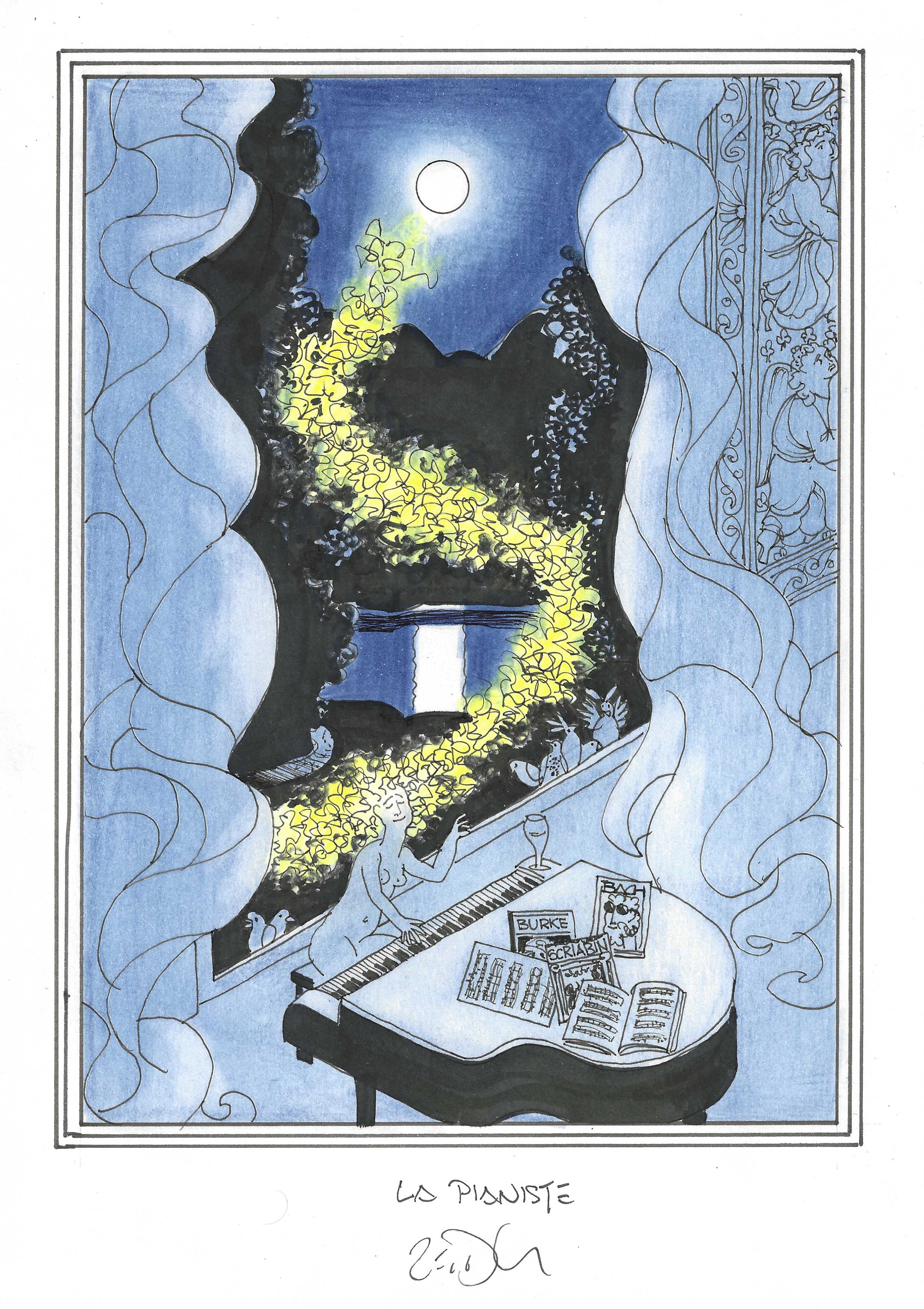 Drawing of the Day – 3327 – Dessin du jour « The pianist – La pianiste » Ink & colour on Paper – 8 x 12″ (21 x 30 cm) – Encre & couleurs sur Papier