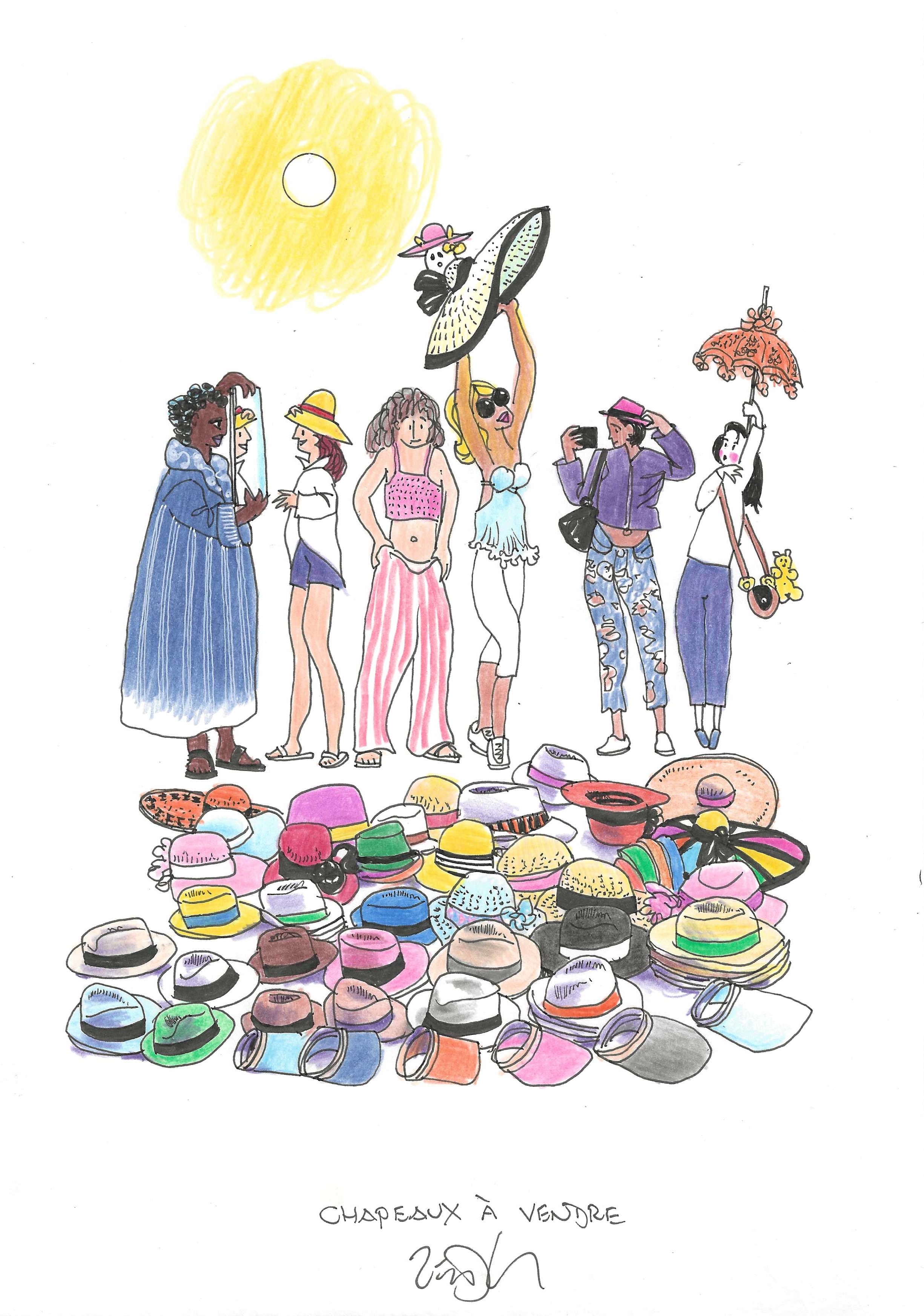Drawing of the Day – 3328 – Dessin du jour « Hats for sale – Chapeaux à vendre » Ink & colour on Paper – 8 x 12″ (21 x 30 cm) – Encre & couleurs sur Papier