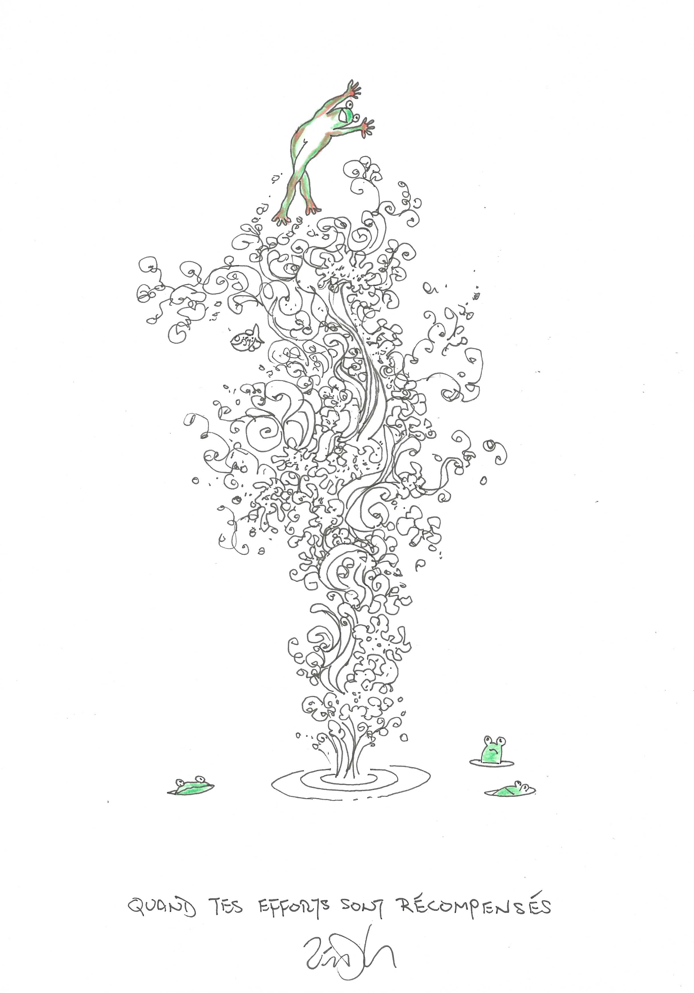 Drawing of the Day – 3329 – Dessin du jour « When all the striving pays off – Quand tes efforts sont récompensés » Ink & colour on Paper – 8 x 12″ (21 x 30 cm) – Encre & couleurs sur Papier