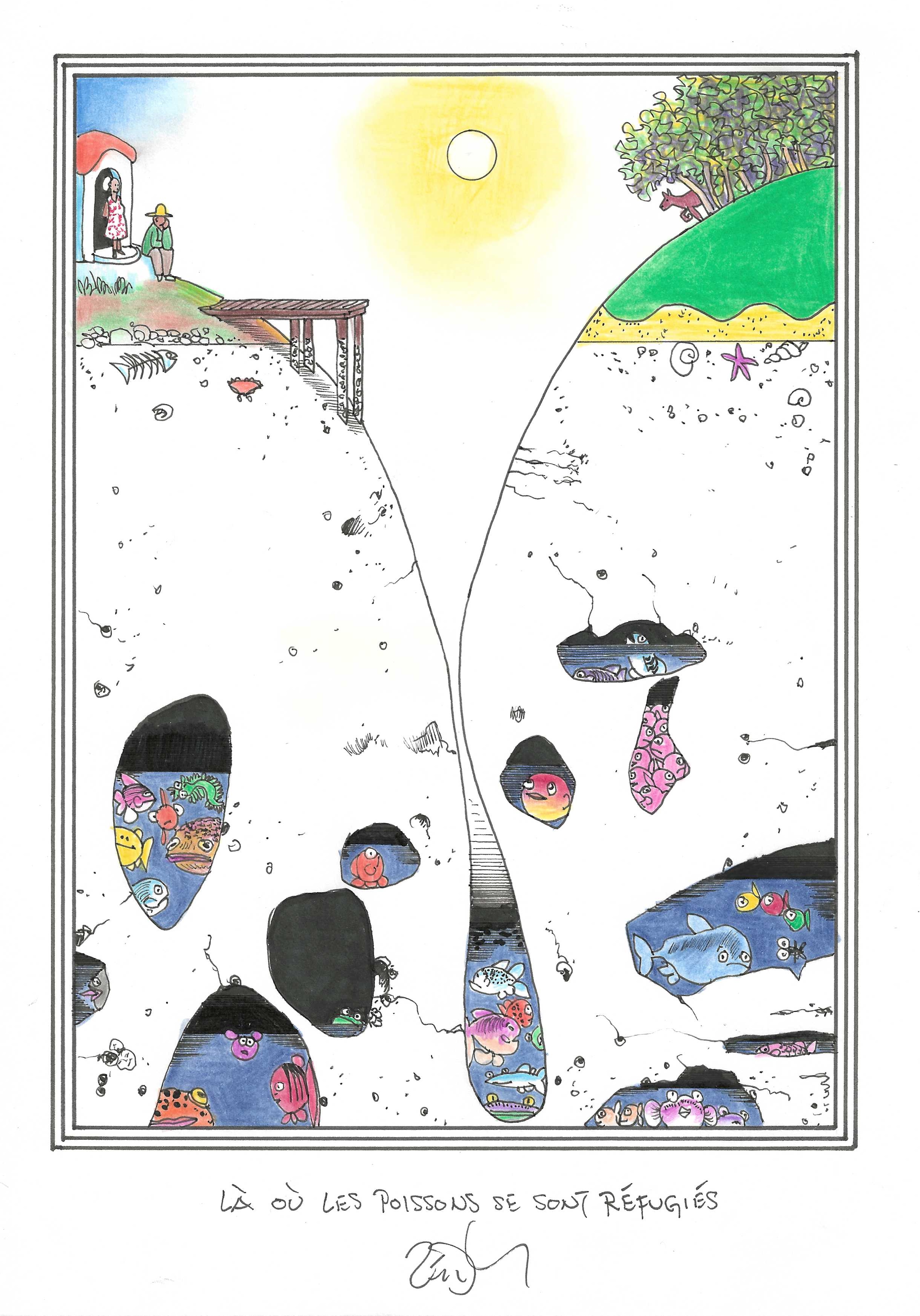 Drawing of the Day – 3331 – Dessin du jour « Where the fish found refuge – Là où les poissons se sont réfugiés » Ink & colour on Paper – 8 x 12″ (21 x 30 cm) – Encre & couleurs sur Papier