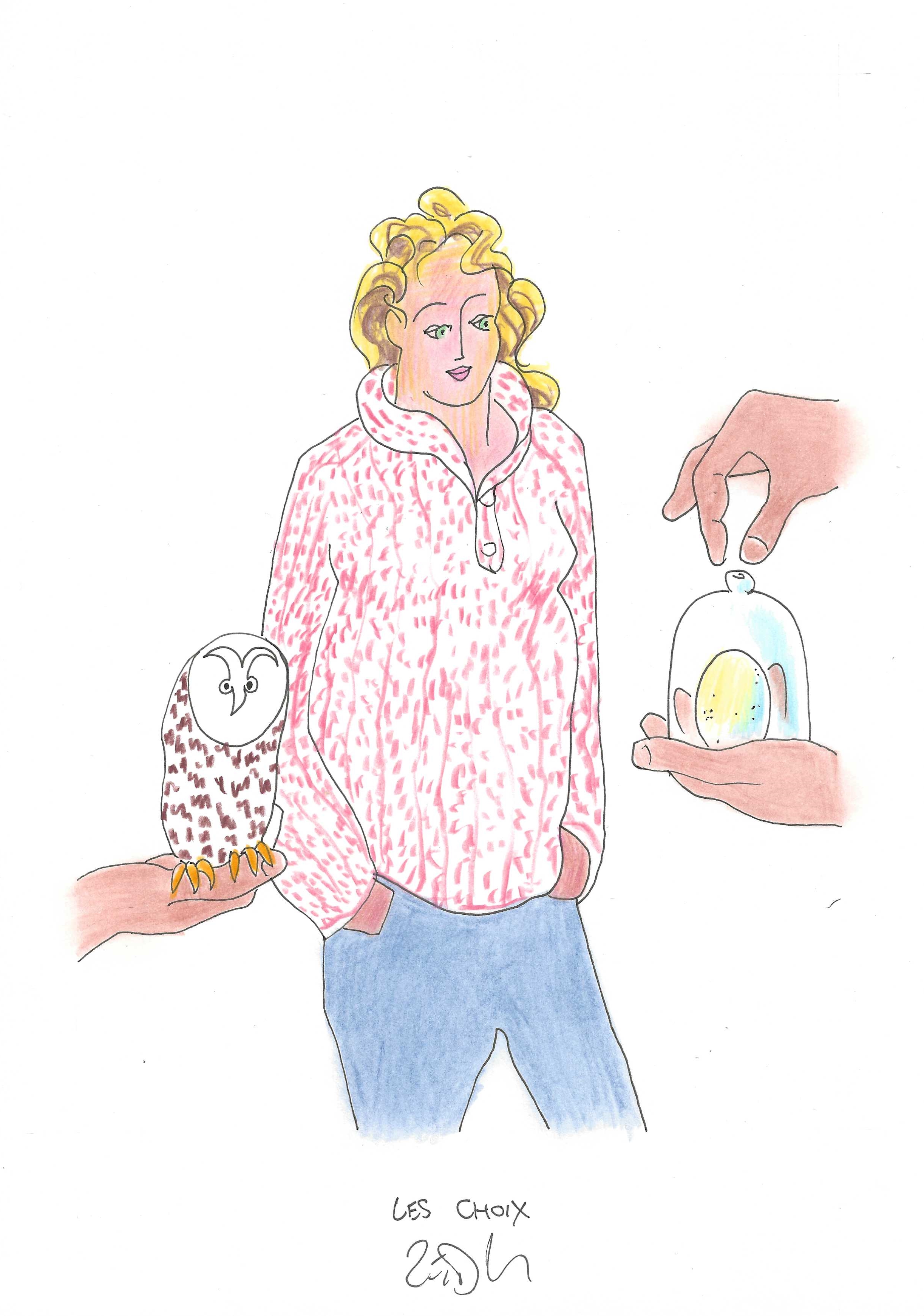 Drawing of the Day – 3333 – Dessin du jour « Choices – Les choix » Ink & colour on Paper – 8 x 12″ (21 x 30 cm) – Encre & couleurs sur Papier