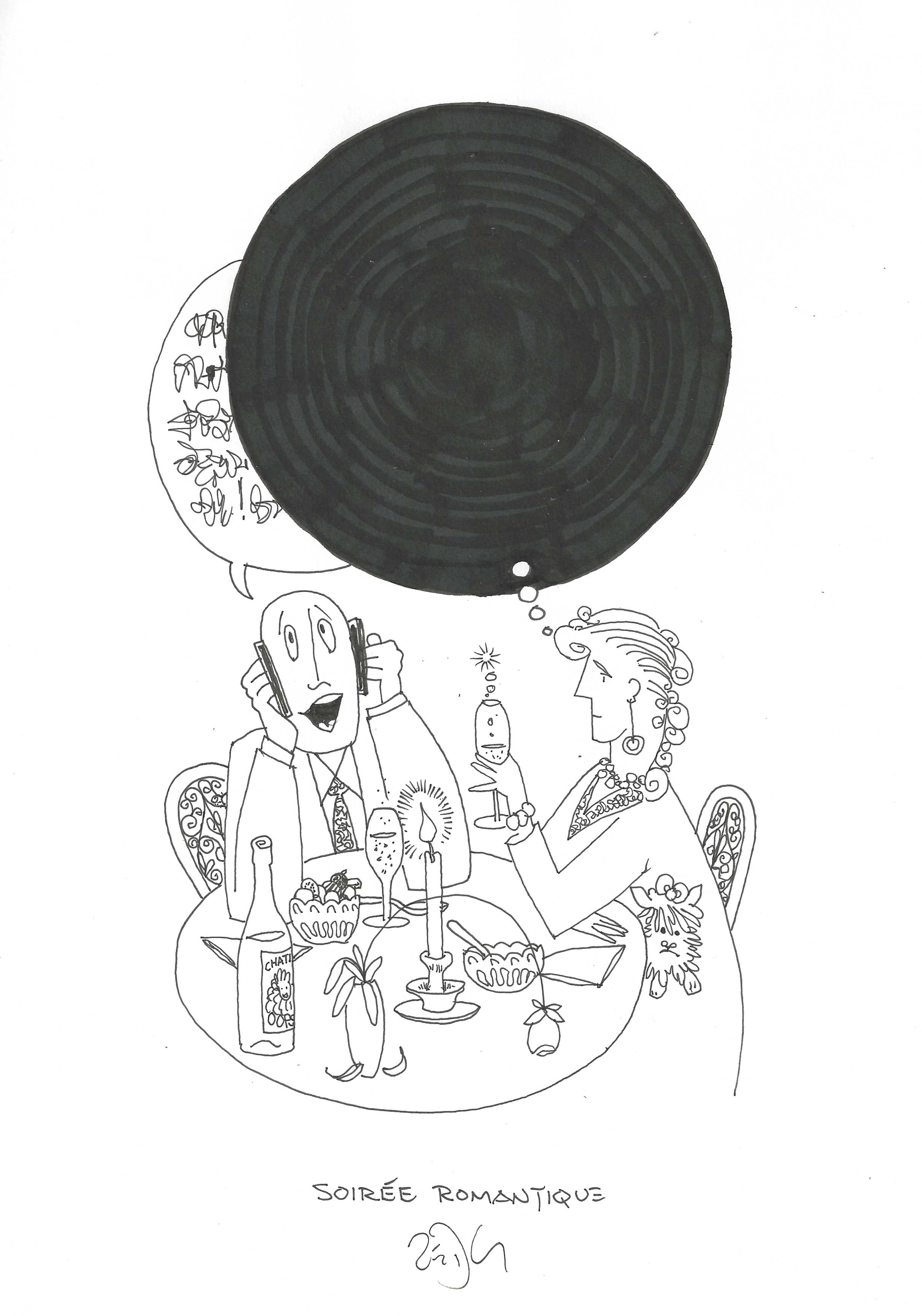 Drawing of the Day – 3248 – Dessin du jour « A romantic evening – Soirée romantique » Ink on Paper – 8 x 12″ (21 x 30 cm) – Encre sur Papier