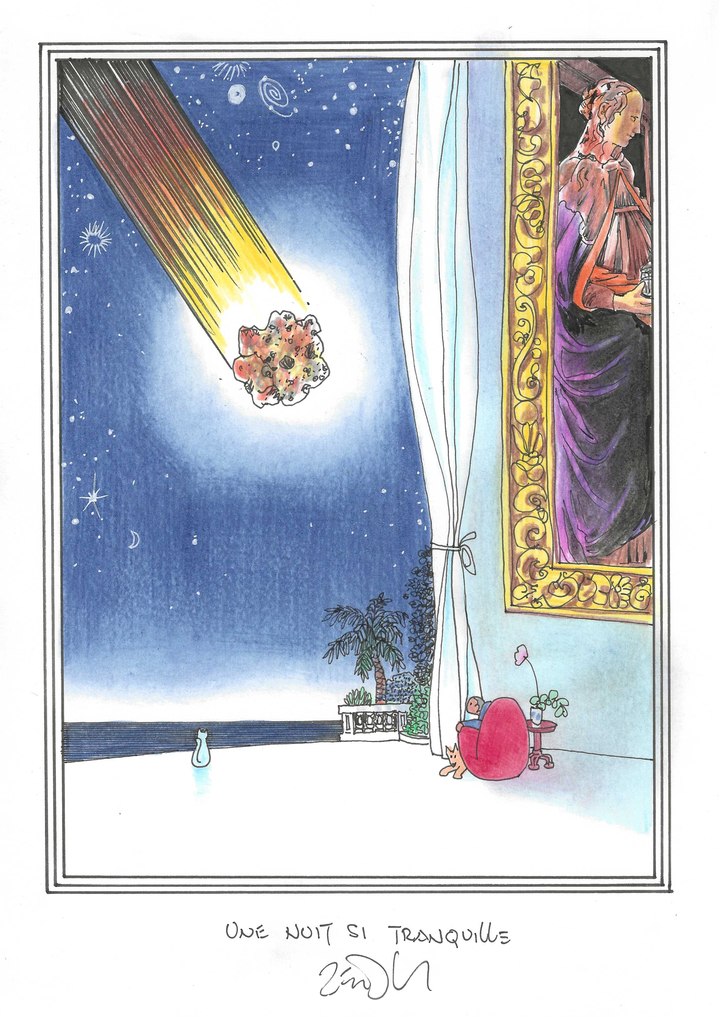 Drawing of the Day – 3250 – Dessin du jour « Such a peaceful night – Une nuit si tranquille » Ink & colour on Paper – 8 x 12″ (21 x 30 cm) – Encre & couleurs sur Papier