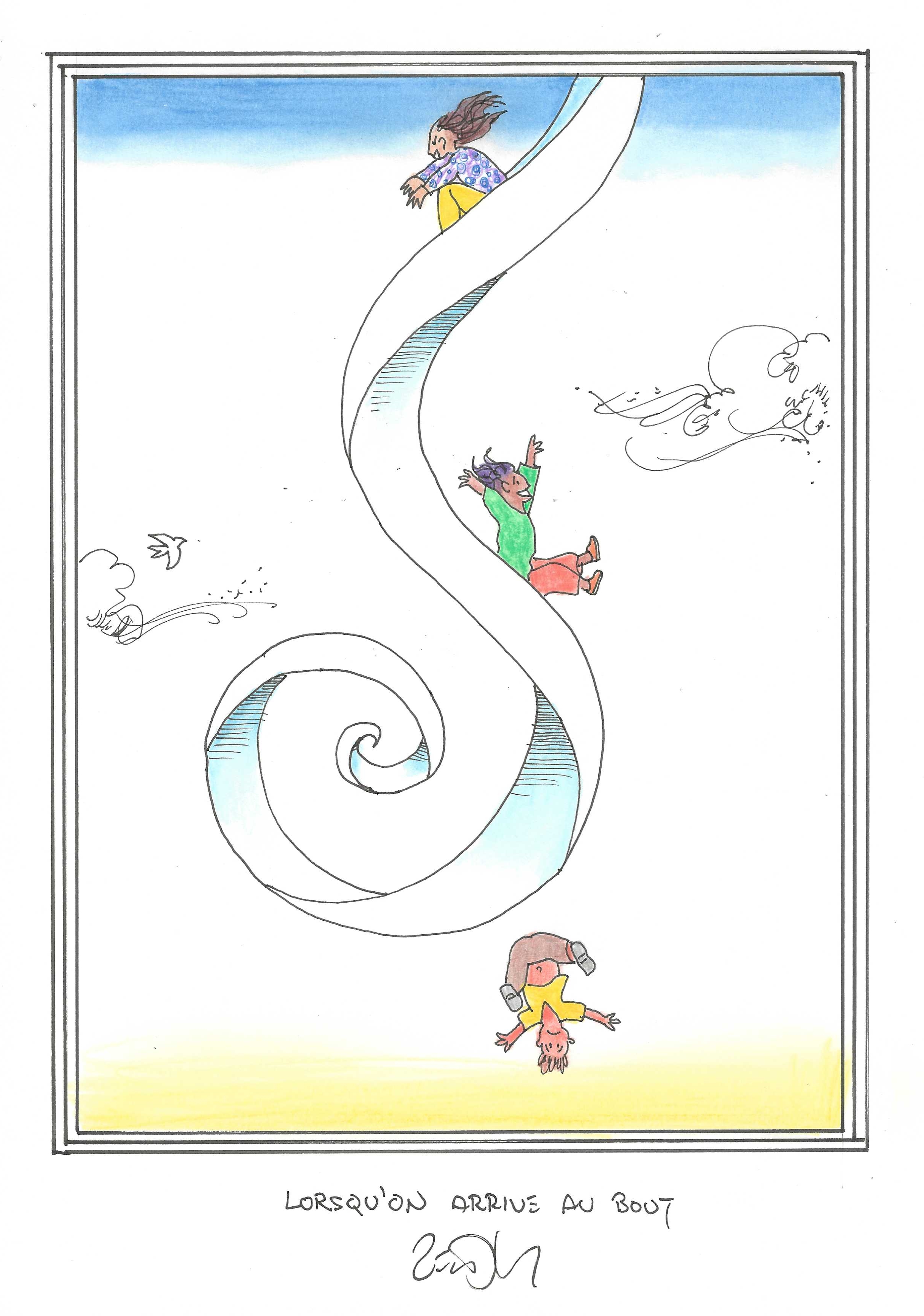 Drawing of the Day – 3253 – Dessin du jour « Until you reach the bottom – Lorsqu’on arrive au bout » Ink & colour on Paper – 8 x 12″ (21 x 30 cm) – Encre & couleurs sur Papier