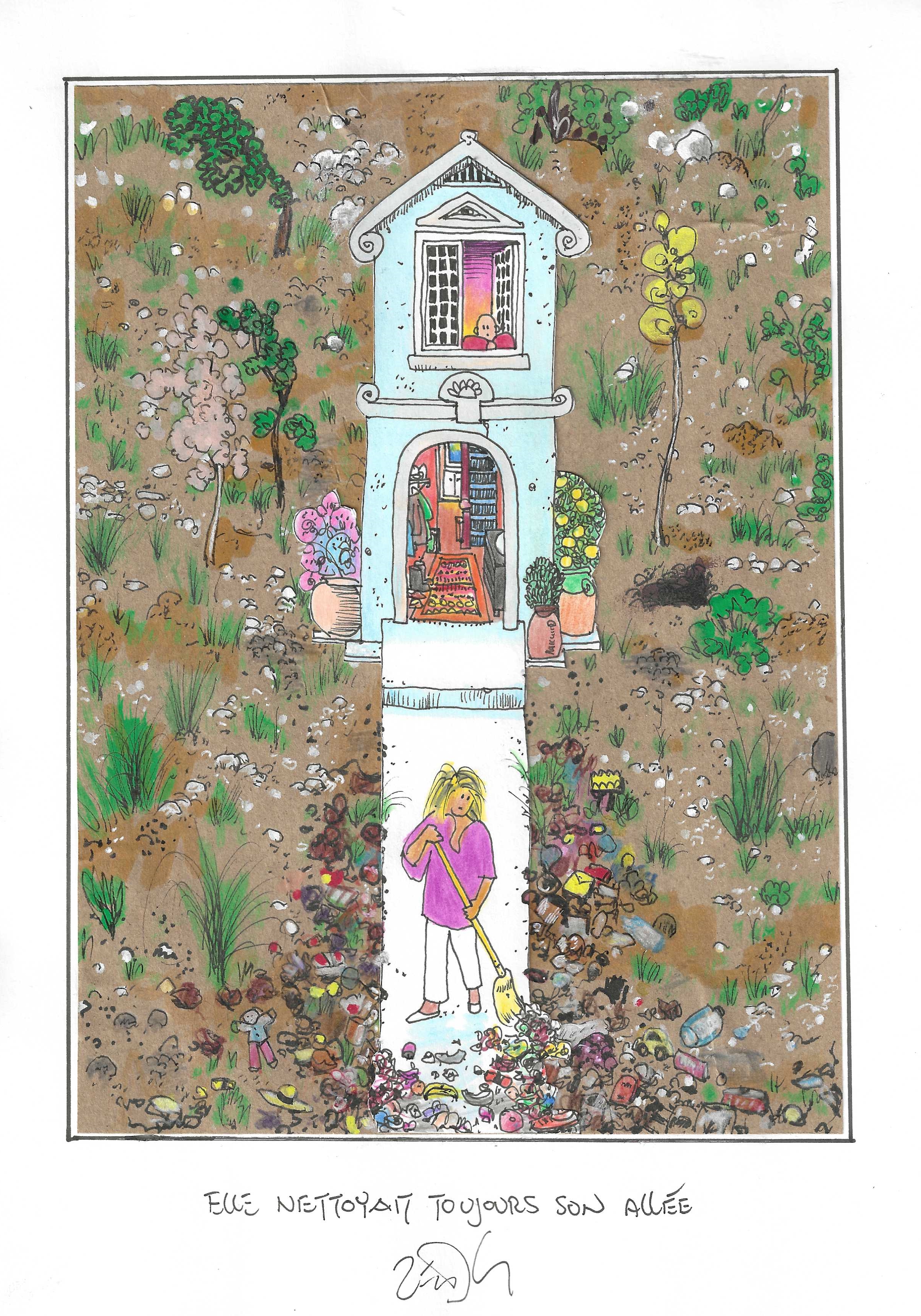 Drawing of the Day – 3254 – Dessin du jour « She always kept her front walk clean – Elle nettoyait toujours son allée » Mixed Media on Paper – 8 x 12″ (21 x 30 cm) – Technique mixte sur Papier