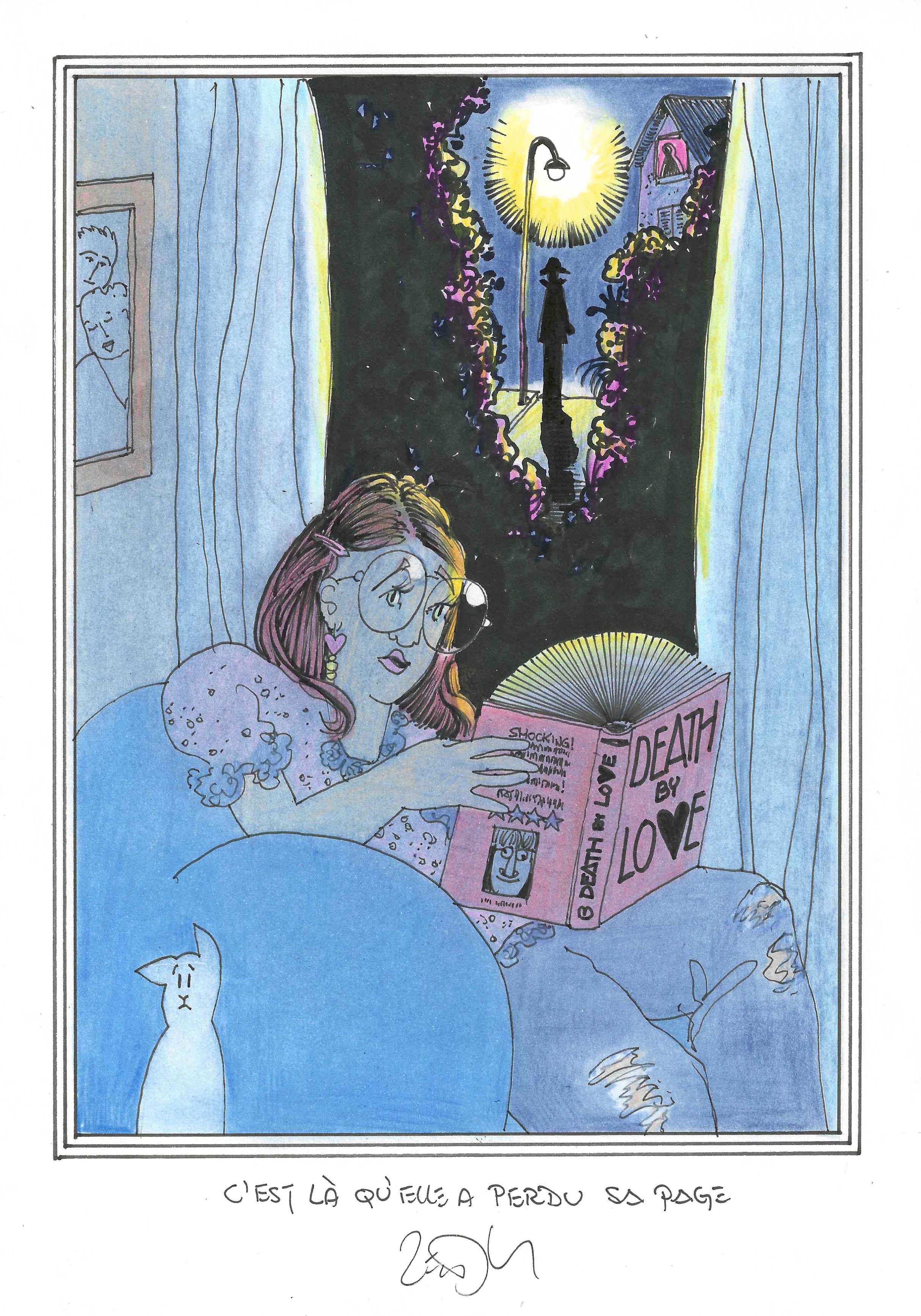 Drawing of the Day – 3255 – Dessin du jour « It was then she lost her page – C’est là qu’elle a perdu sa page » Ink & colour on Paper – 8 x 12″ (21 x 30 cm) – Encre & couleurs sur Papier