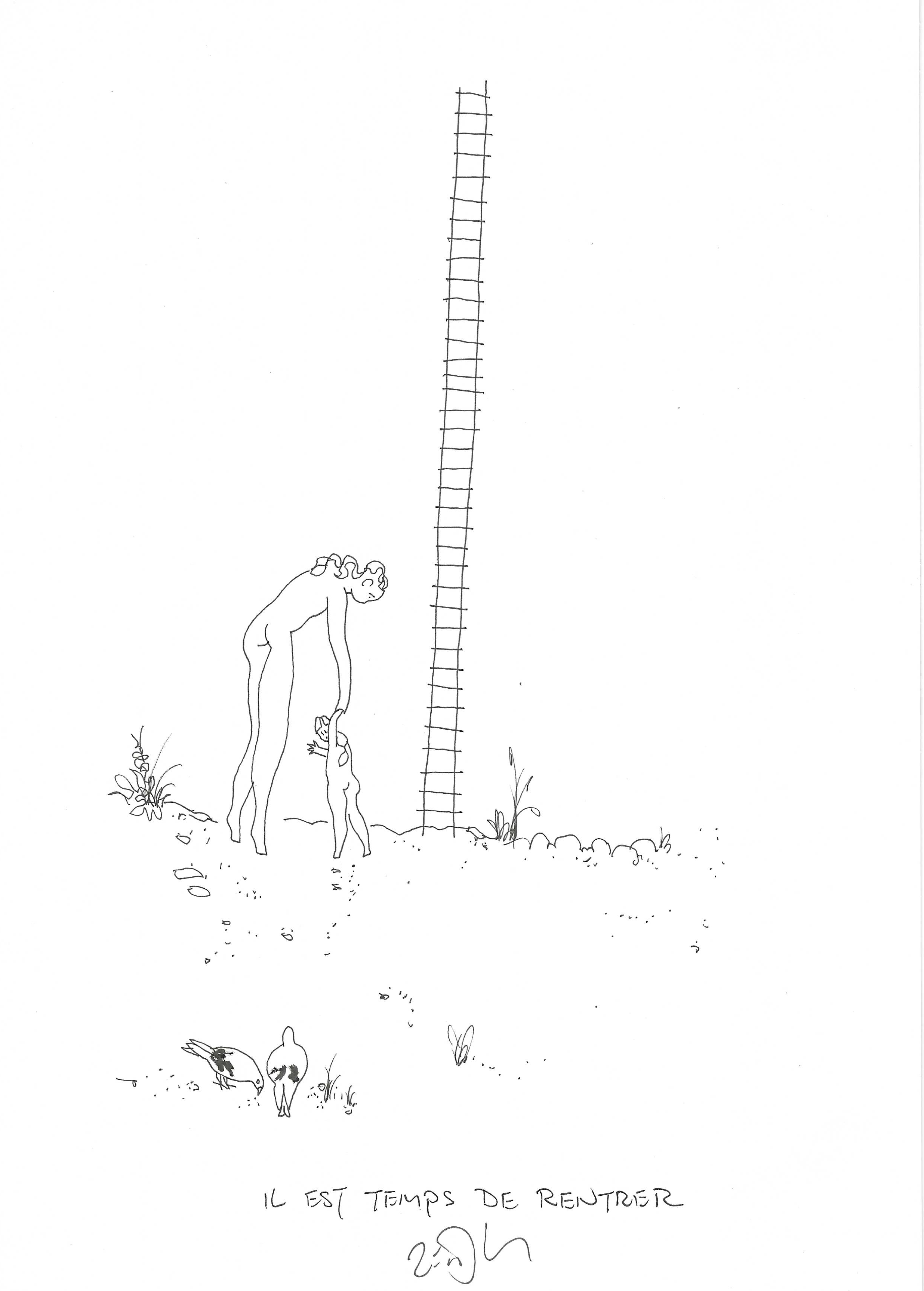 Drawing of the Day – 3166 – Dessin du jour « Time to go home – Il est temps de rentrer » Ink on Paper – 8 x 12″ (21 x 30 cm) – Encre sur Papier