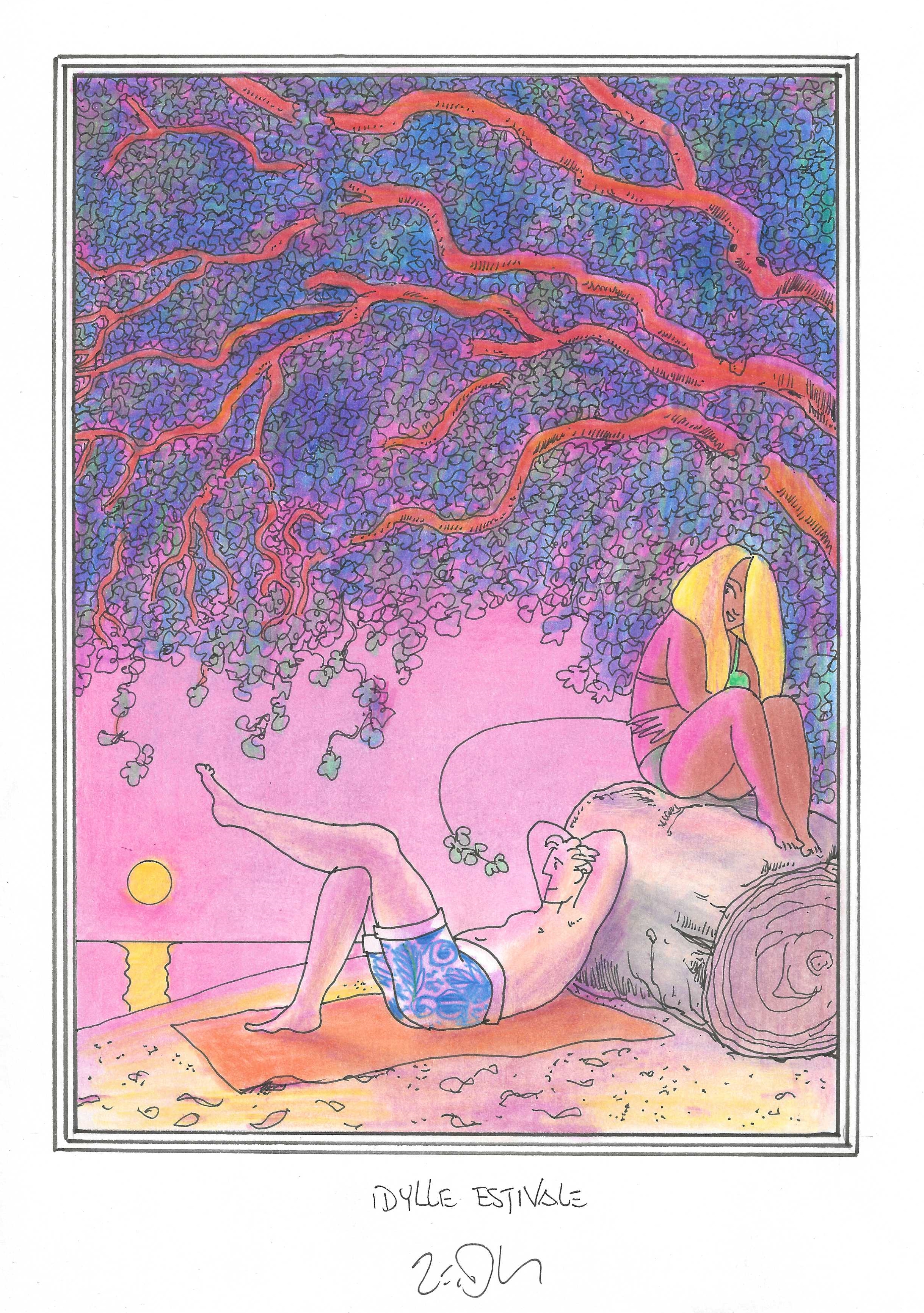 Drawing of the Day – 3175 – Dessin du jour « Summer romance – Idylle estivale » Ink & colour on Paper – 8 x 12″ (21 x 30 cm) – Encre & couleurs sur Papier