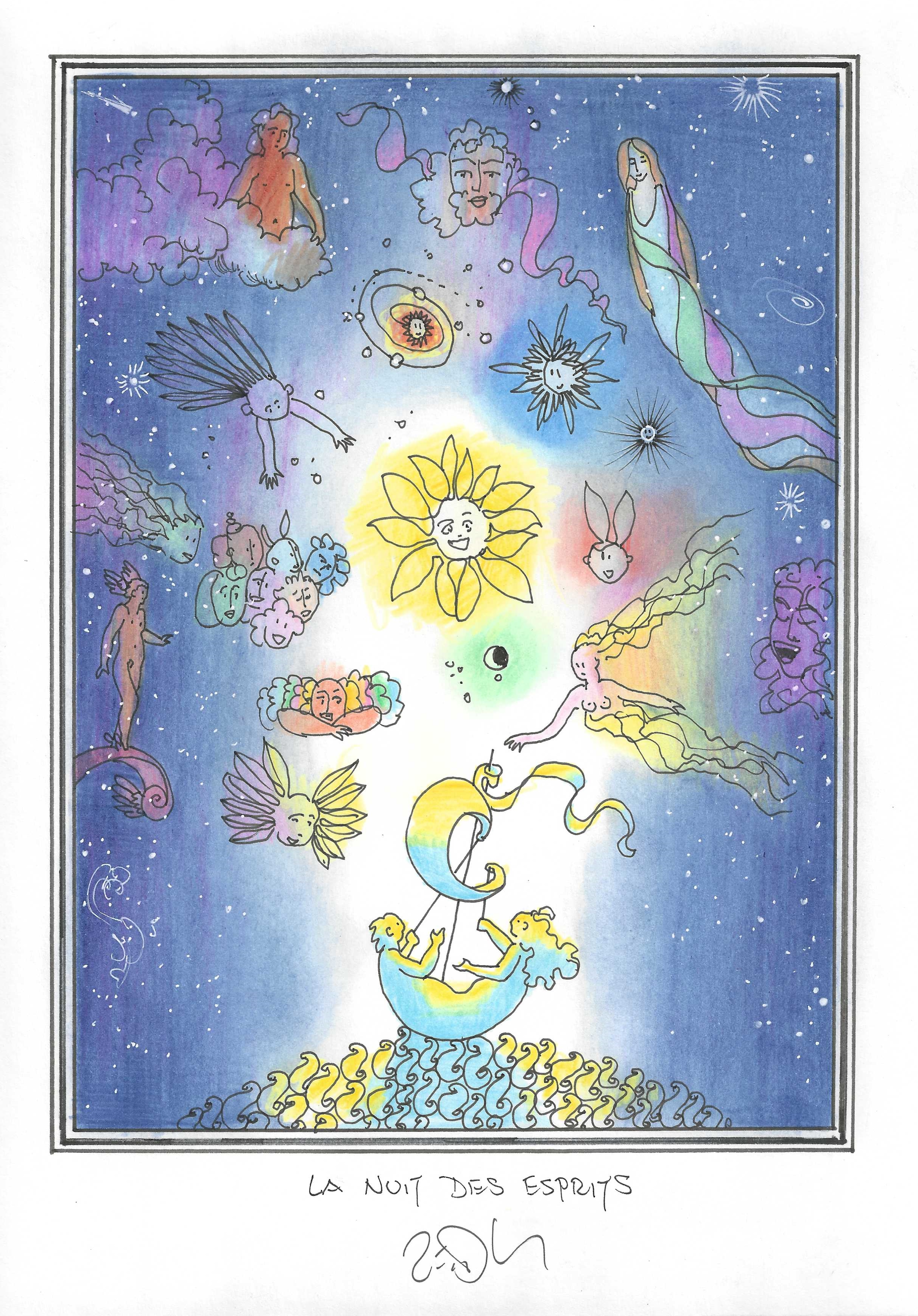 Drawing of the Day – 3147 – Dessin du jour « Night of the spirits – La nuit des esprits » Ink & colour on Paper – 8 x 12″ (21 x 30 cm) – Encre & couleurs sur Papier