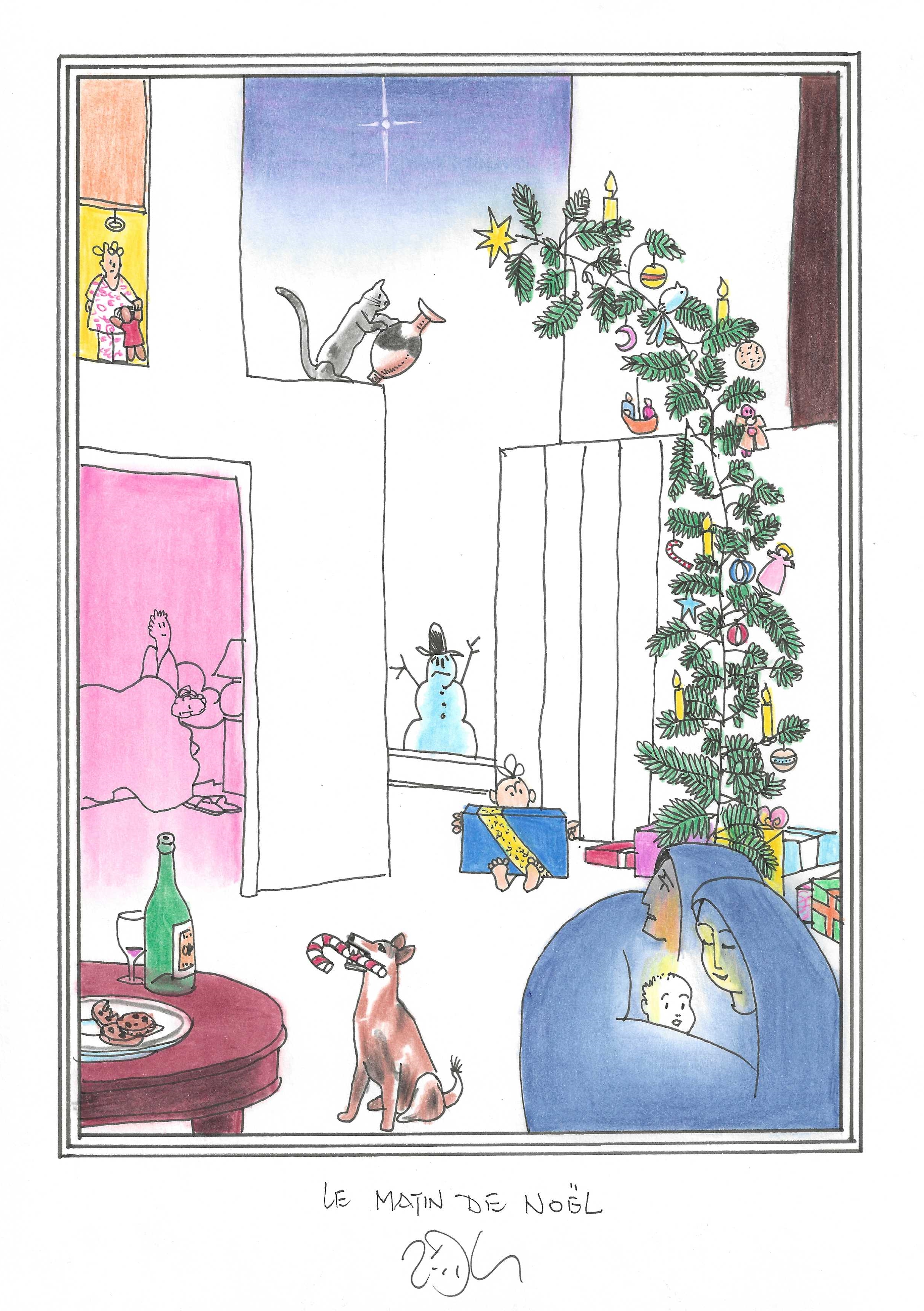 Drawing of the Day – 3148 – Dessin du jour « Christmas morning – Le matin de Noël » Ink & colour on Paper – 8 x 12″ (21 x 30 cm) – Encre & couleurs sur Papier