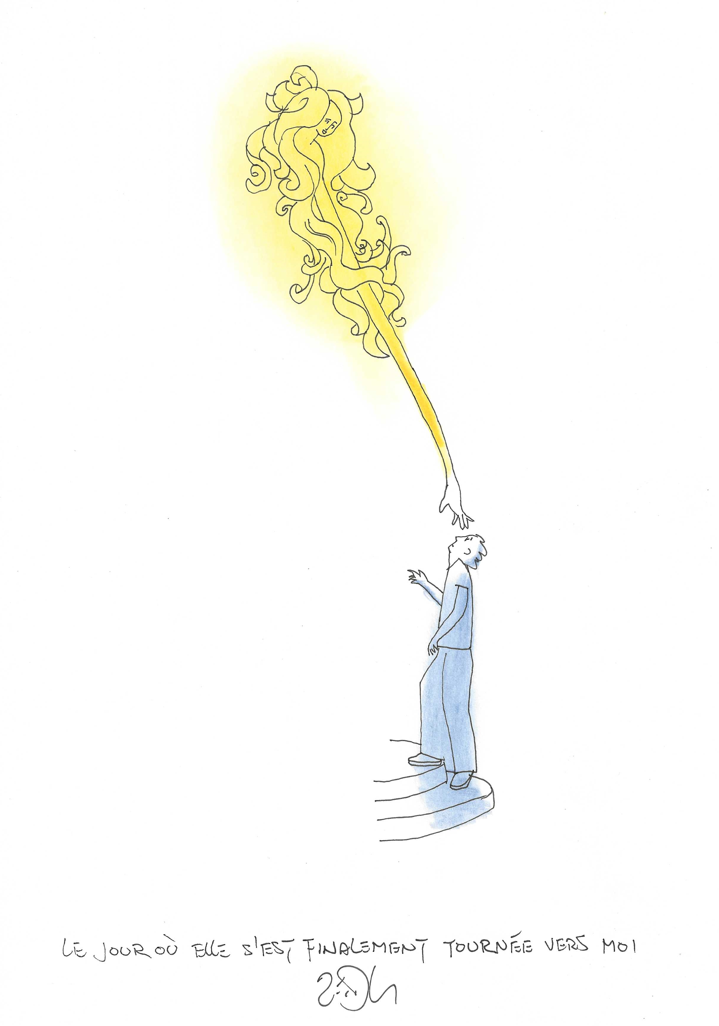 Drawing of the Day – 3149 – Dessin du jour « The day she finaly reached out to me – Le jour ou elle s’est finalement tournée vers moi » Ink & colour on Paper – 8 x 12″ (21 x 30 cm) – Encre & couleurs sur Papier