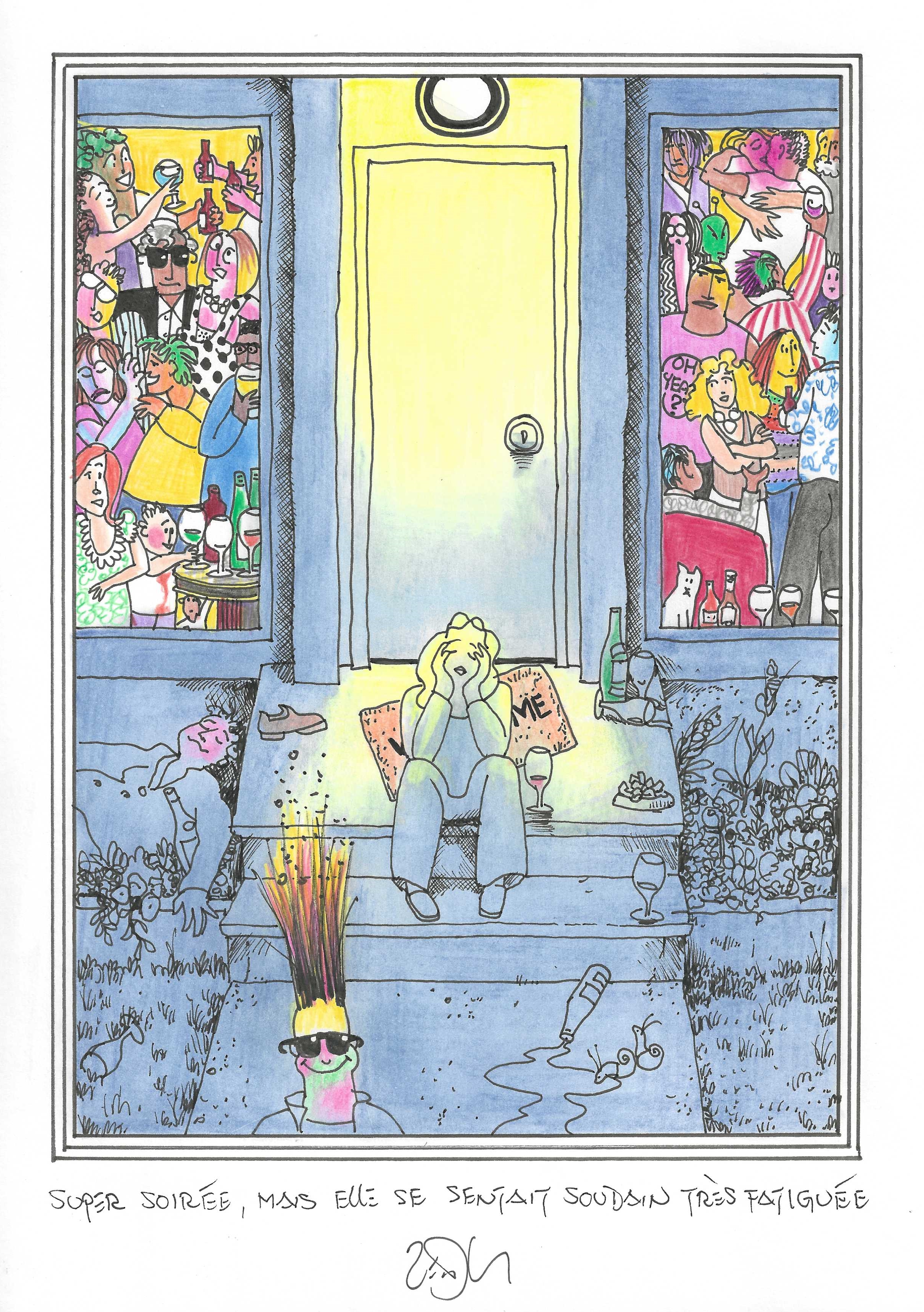Drawing of the Day – 3153 – Dessin du jour « Great party, but she was getting very tired – Super soirée, mais elle se sentait très fatiguée » Ink & colour on Paper – 8 x 12″ (21 x 30 cm) – Encre & couleurs sur Papier