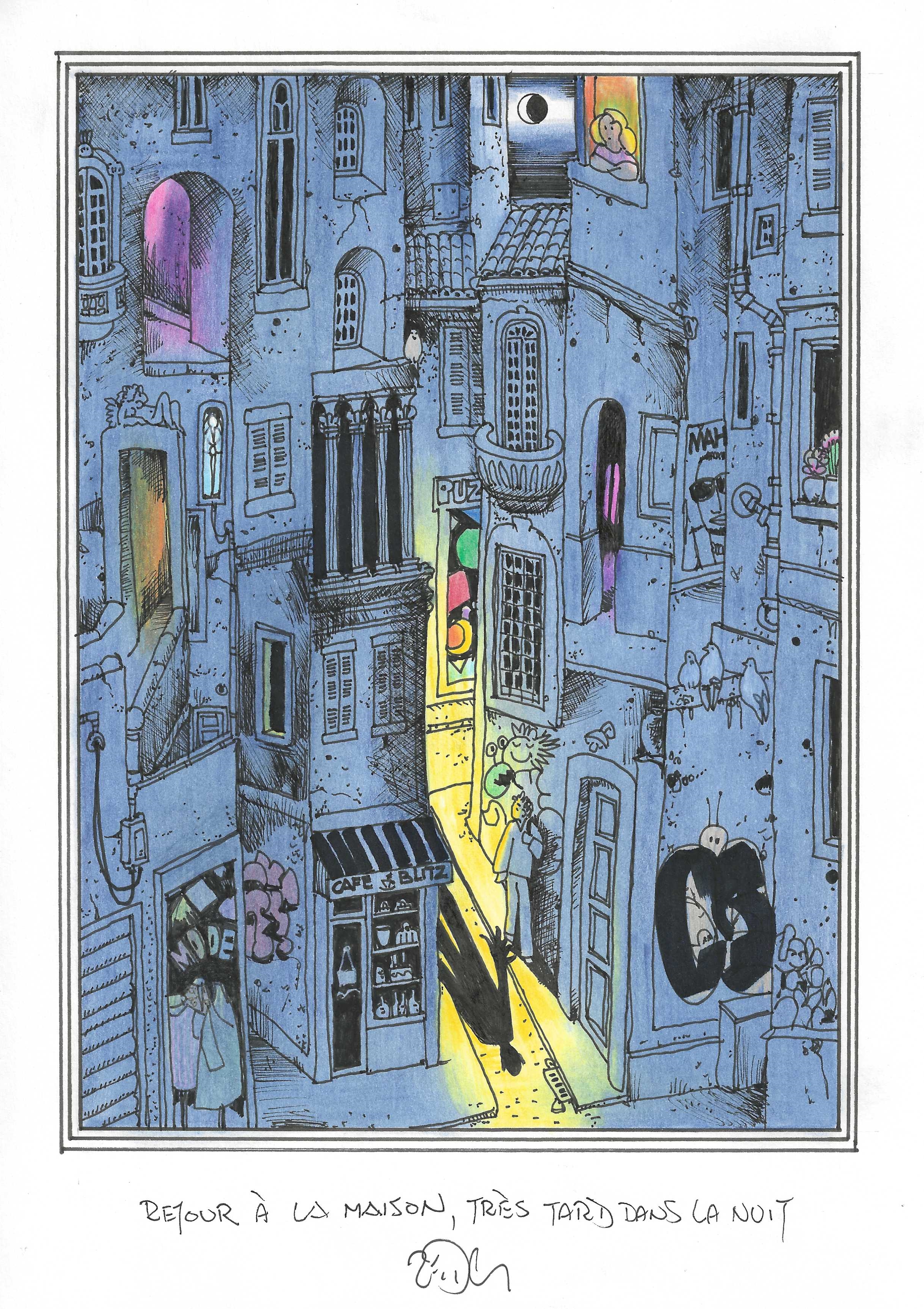 Drawing of the Day – 3155 – Dessin du jour « Going home, very late at night – Retour à la maison, très tard dans la nuit » Ink & colour on Paper – 8 x 12″ (21 x 30 cm) – Encre & couleurs sur Papier