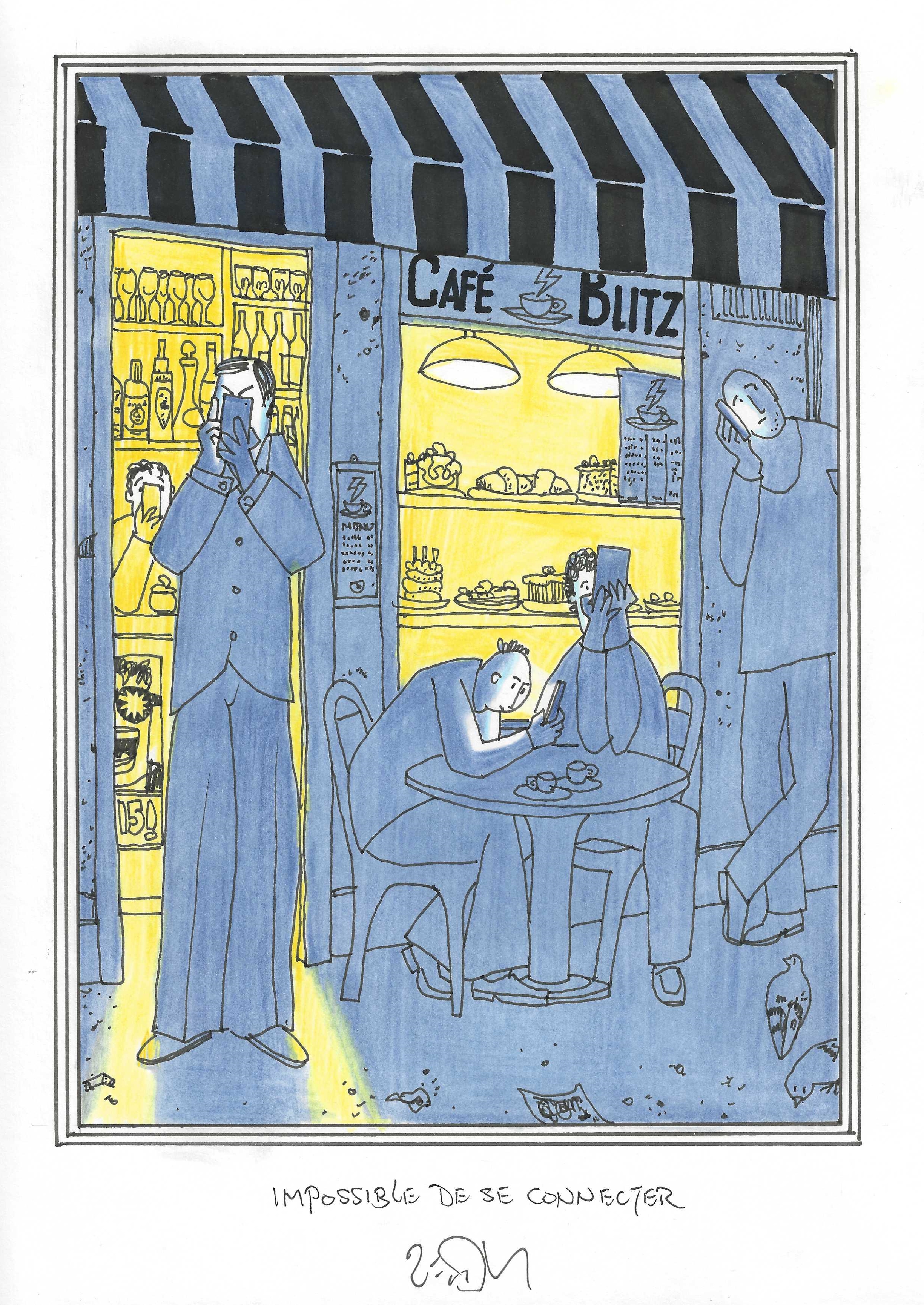 Drawing of the Day – 3119 – Dessin du jour « Can’t get a signal – Impossible de se connecter » Ink & colour on Paper – 8 x 12″ (21 x 30 cm) – Encre & couleurs sur Papier