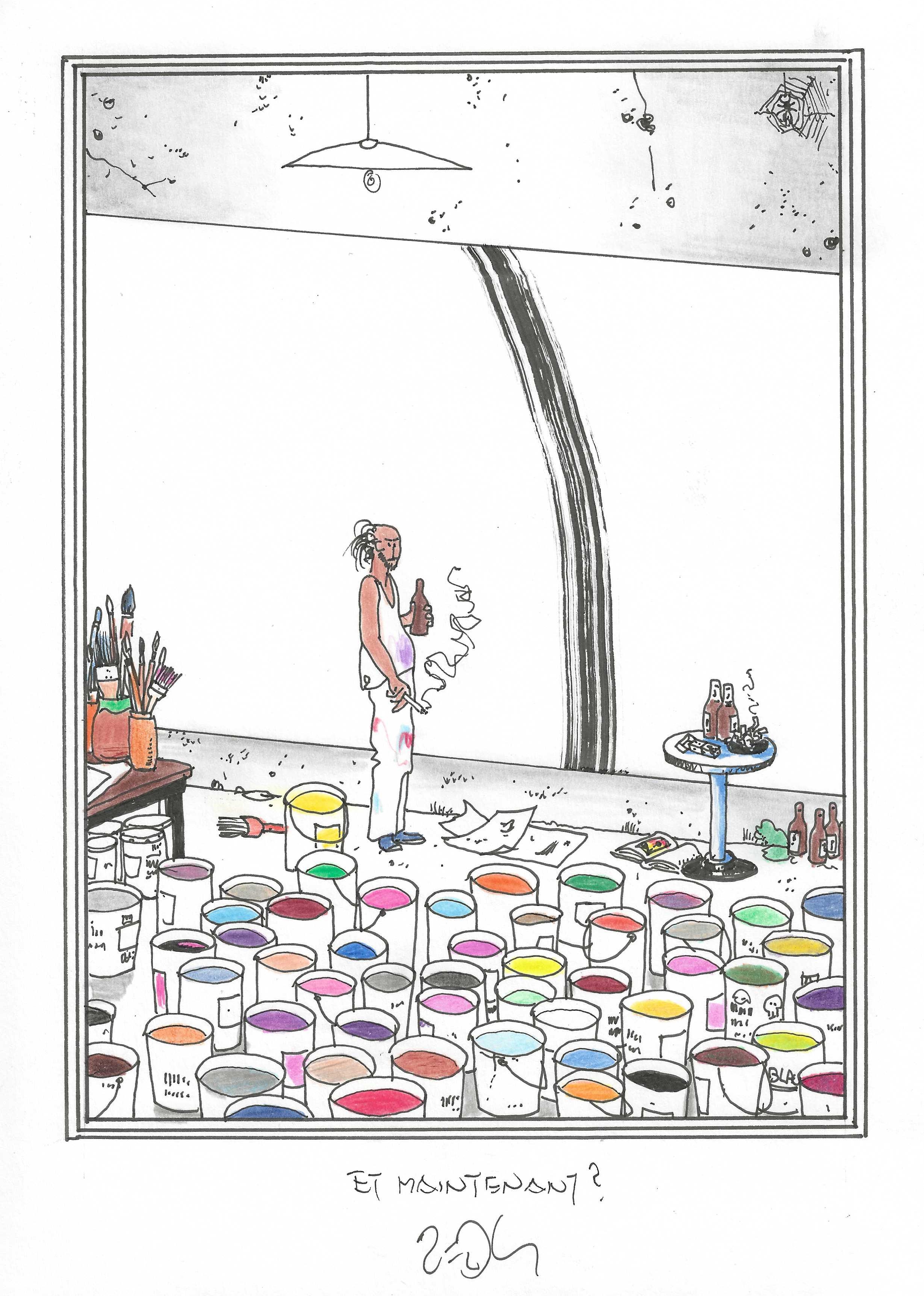 Drawing of the Day – 3122 – Dessin du jour « Now what ? – Et maintenant ? » Ink & colour on Paper – 8 x 12″ (21 x 30 cm) – Encre & couleurs sur Papier