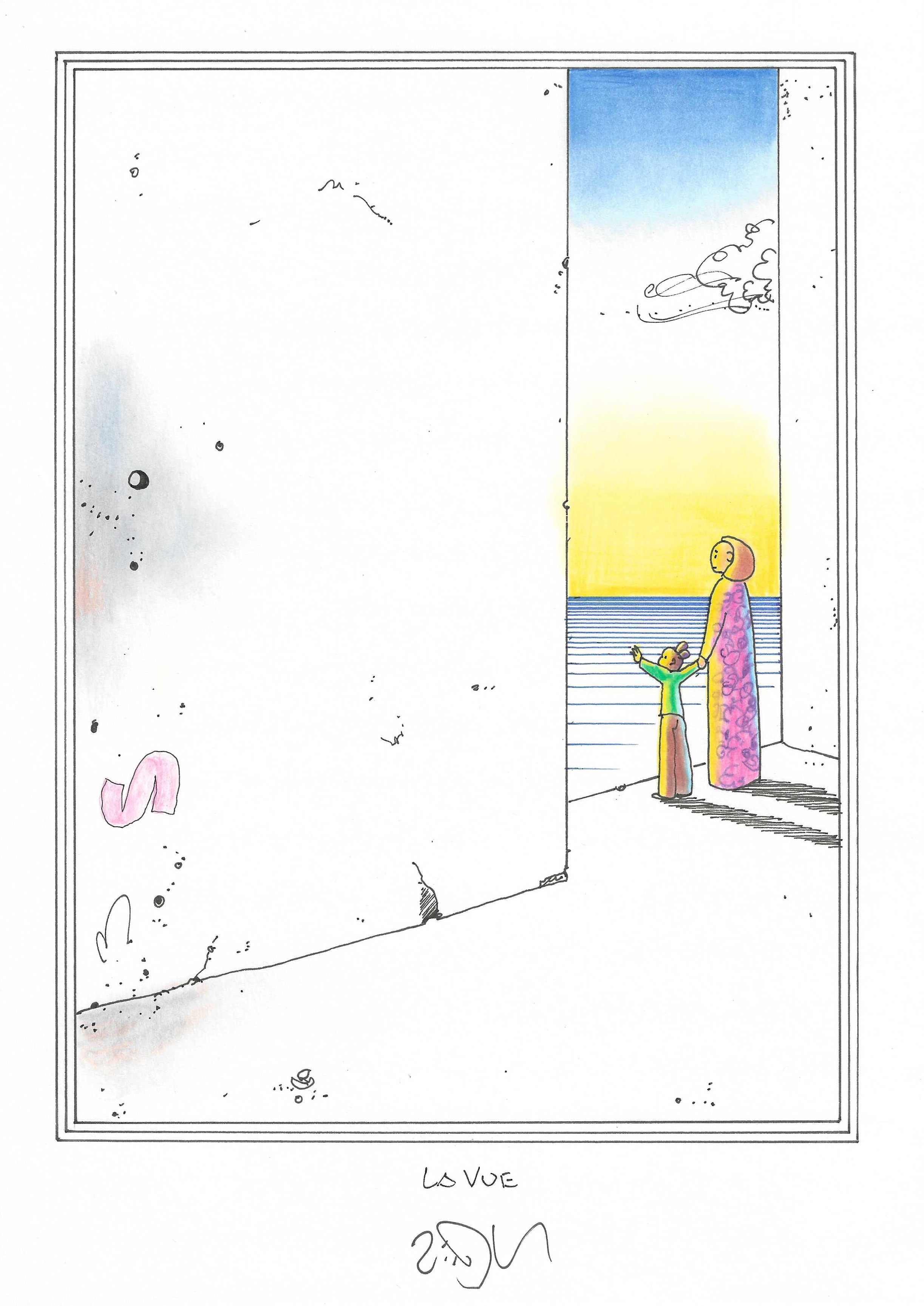 Drawing of the Day – 3124 – Dessin du jour « The view – La vue » Ink & colour on Paper – 8 x 12″ (21 x 30 cm) – Encre & couleurs sur Papier