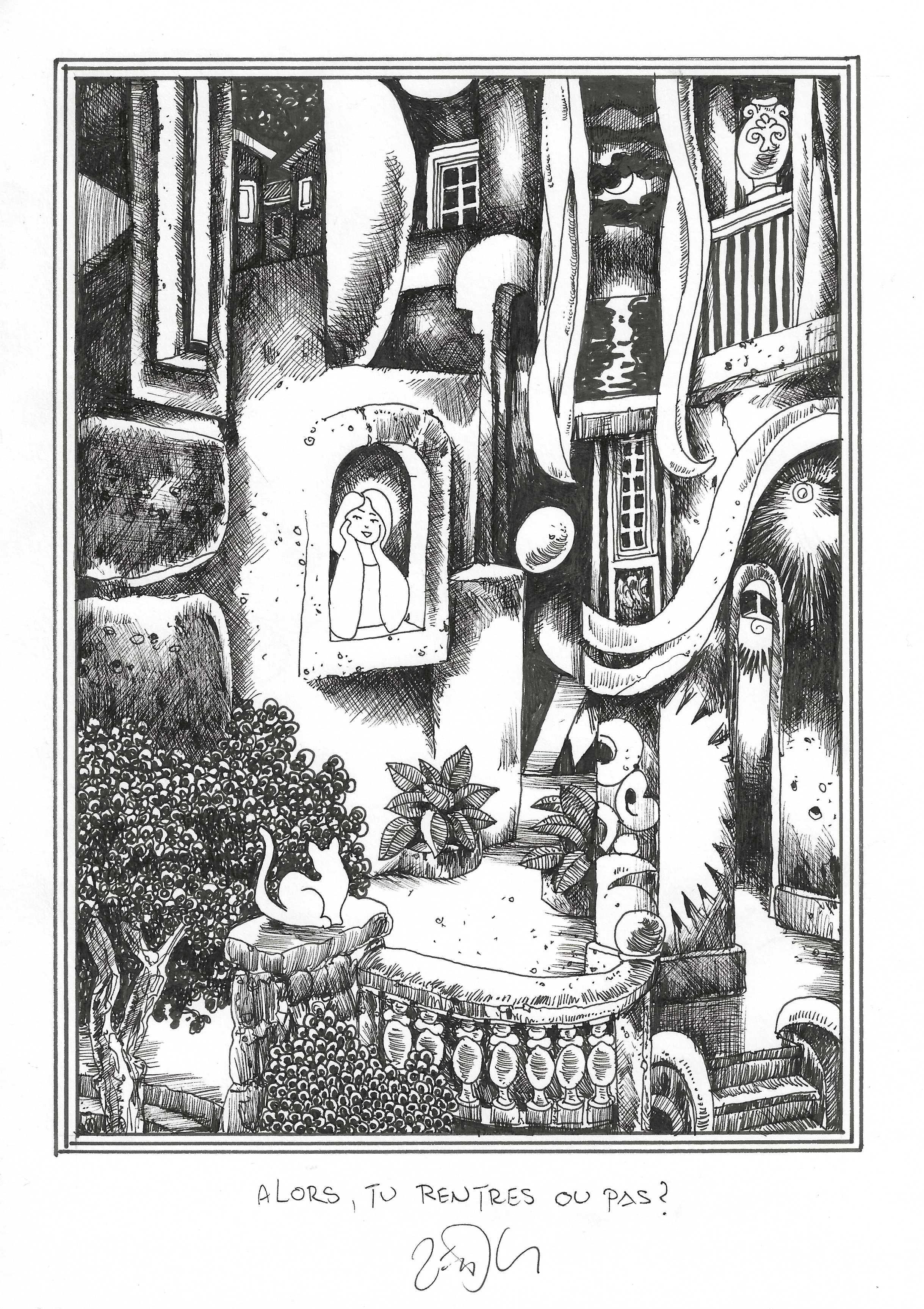 Drawing of the Day – 3038 – Dessin du jour « Are you coming home or not ? – Alors, tu rentres ou pas ? » Ink on Paper – 8 x 12″ (21 x 30 cm) – Encre sur Papier