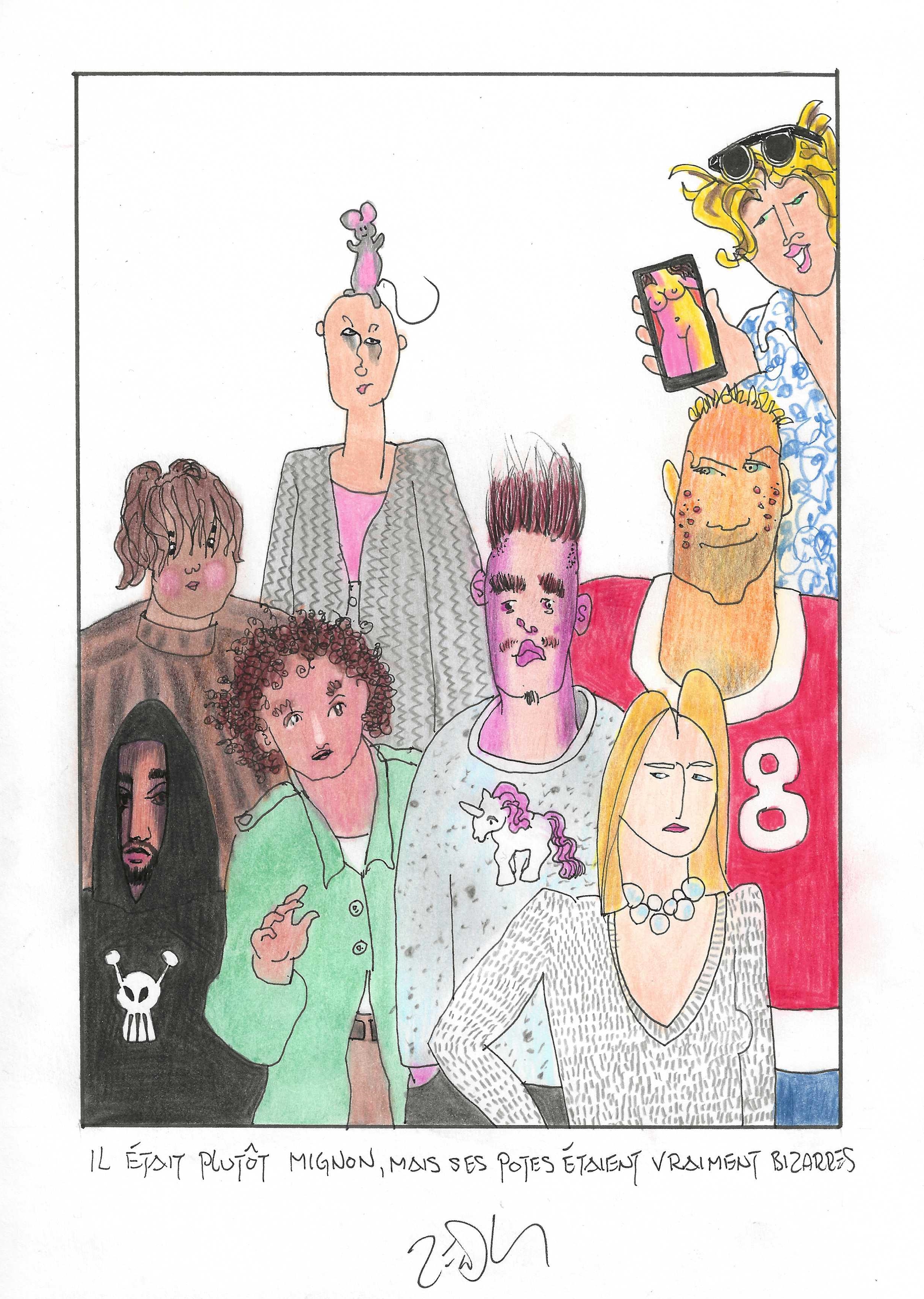 Drawing of the Day – 3040 – Dessin du jour « He was kind of cute, but his friends were really weird – Il était plutôt mignon, mais ses potes étaient vraiment bizarres » Ink & colour on Paper – 8 x 12″ (21 x 30 cm) – Encre & couleurs sur Papier