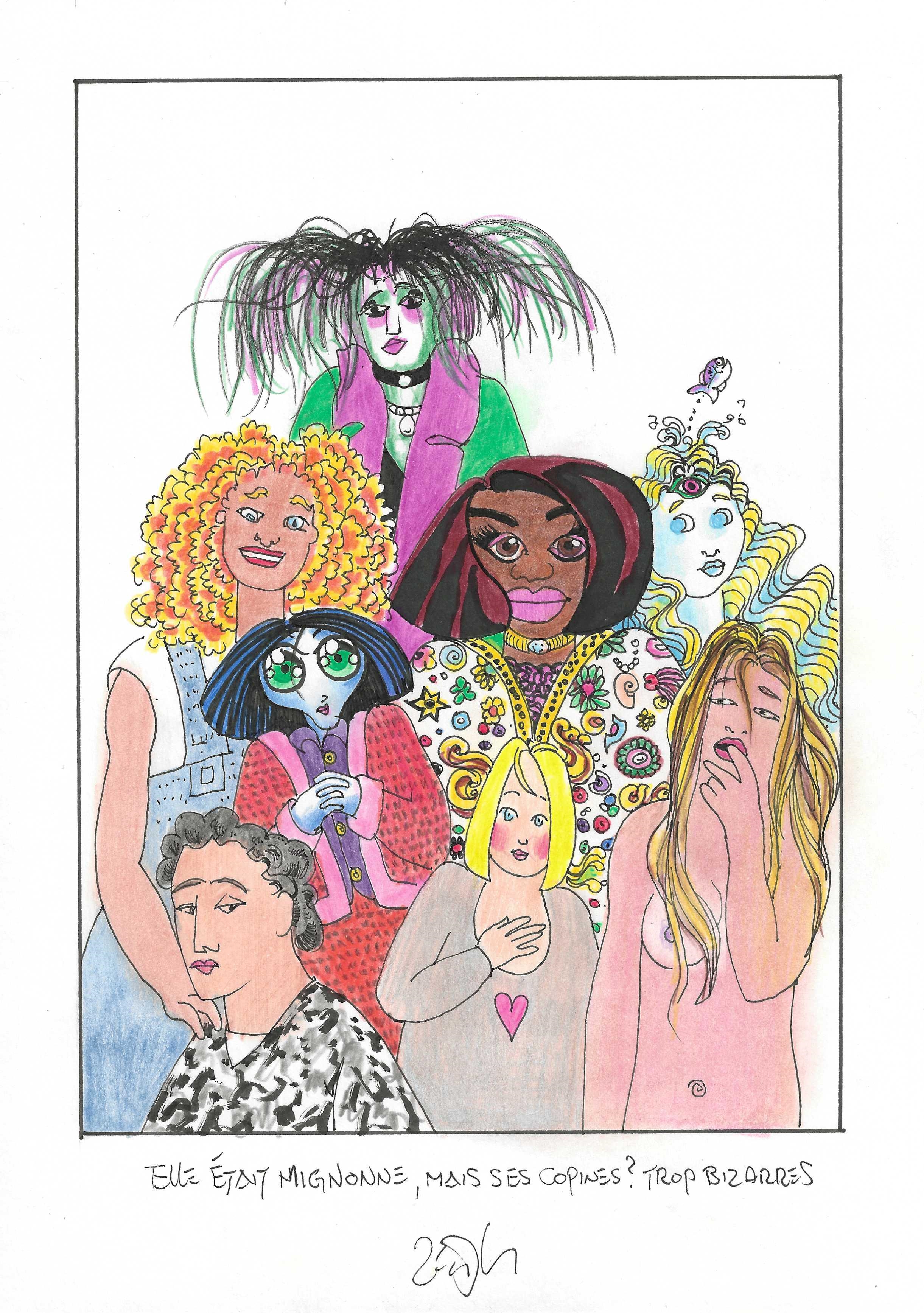 Drawing of the Day – 3041 – Dessin du jour « She was cute, but her friends ? Too weird – Elle était mignonne, mais ses copines ? Trop bizarres » Ink & colour on Paper – 8 x 12″ (21 x 30 cm) – Encre & couleurs sur Papier