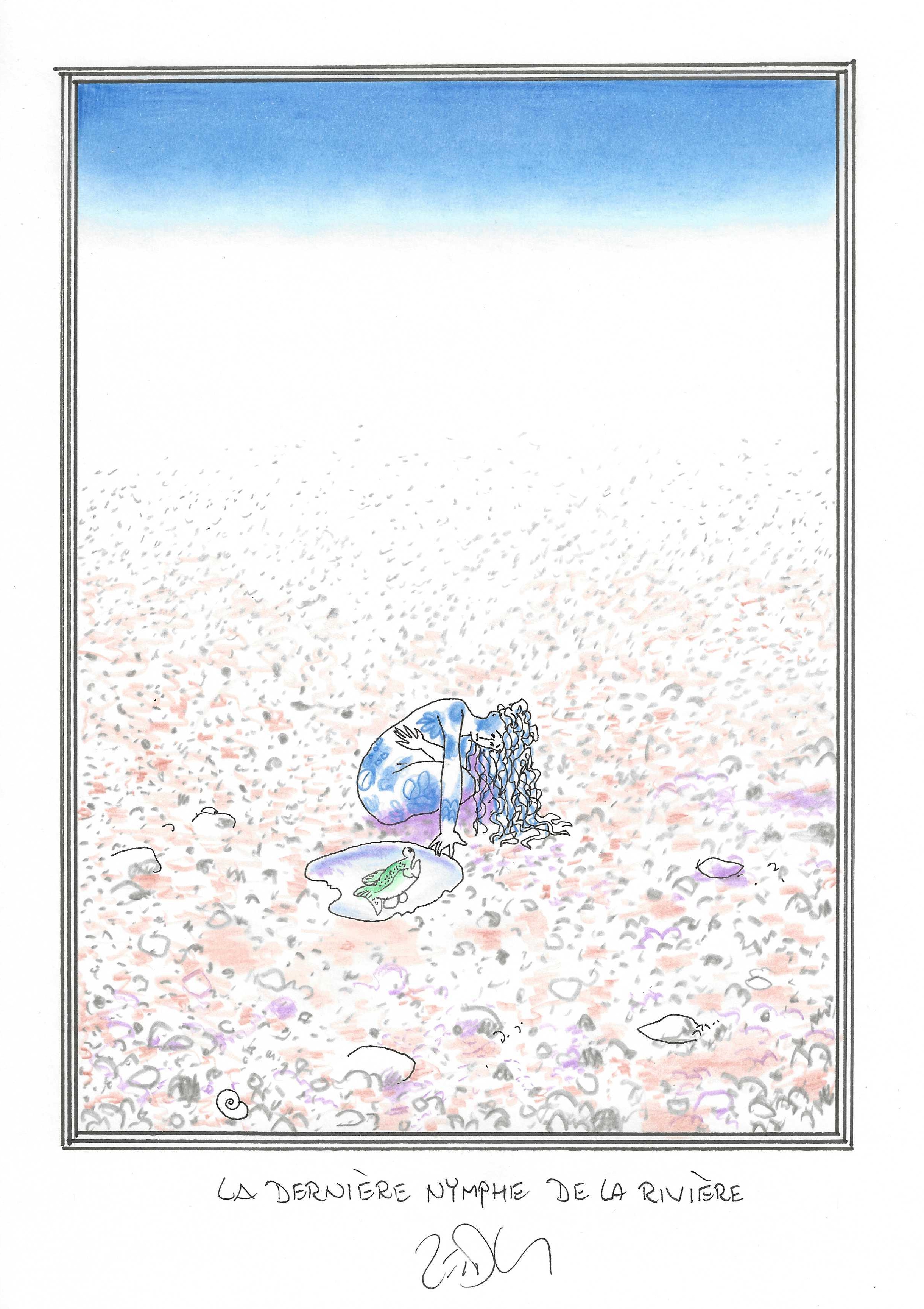 Drawing of the Day – 3042 – Dessin du jour « The last river nymph – La dernière nymphe de la rivière » Ink & colour on Paper – 8 x 12″ (21 x 30 cm) – Encre & couleurs sur Papier