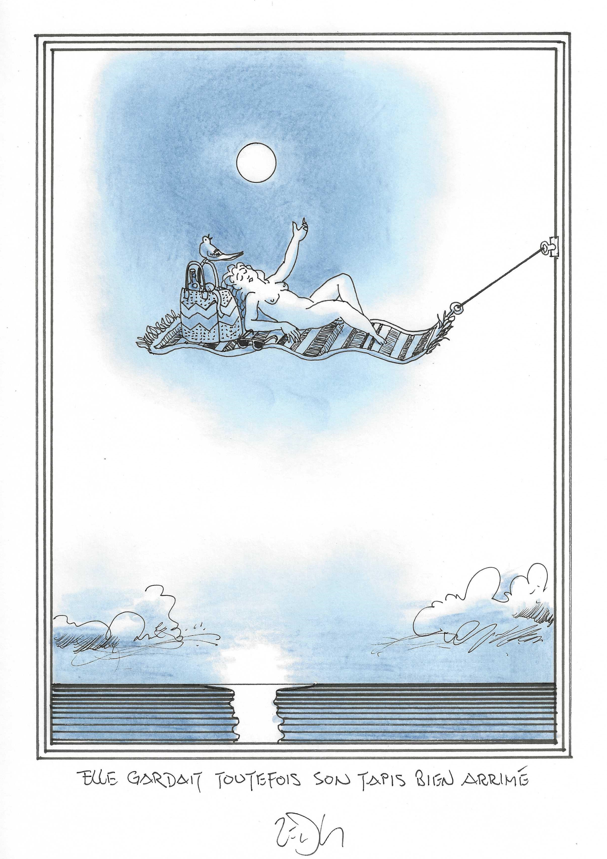Drawing of the Day – 3043 – Dessin du jour « Nonetheless, she kept her carpet well tethered – Elle gardait toutefois son tapis bien arrimé » Ink & colour on Paper – 8 x 12″ (21 x 30 cm) – Encre & couleurs sur Papier