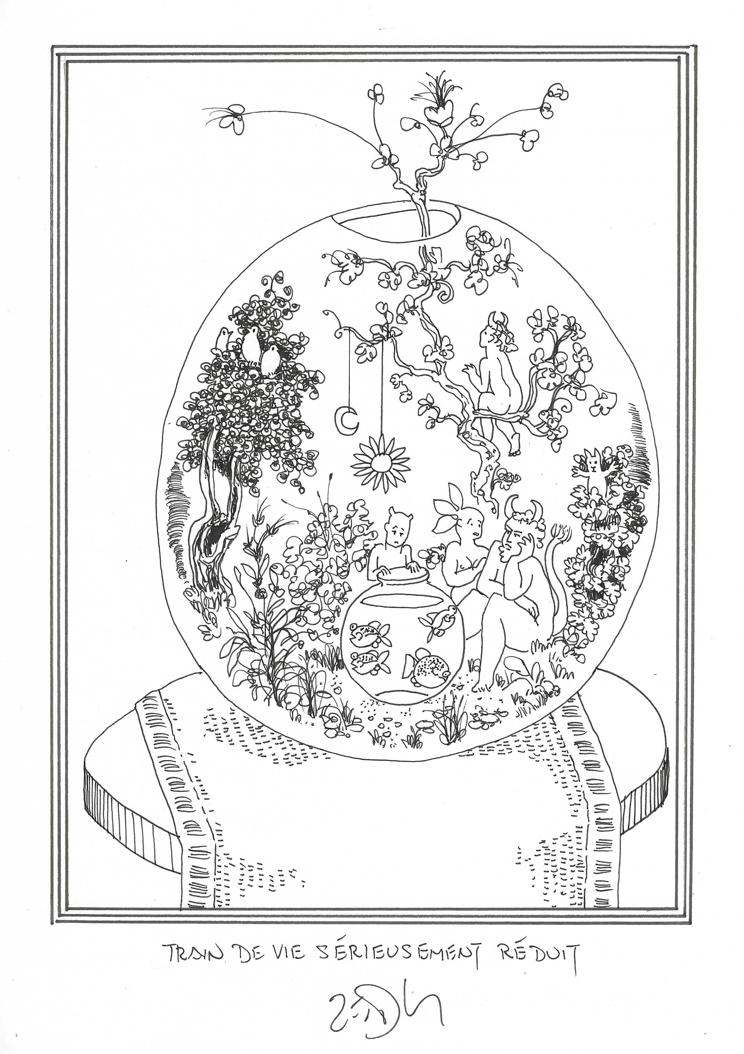 Drawing of the Day – 3045 – Dessin du jour « Seriously reduced lifestyle – Train de vie sérieusement réduit » Ink on Paper – 8 x 12″ (21 x 30 cm) – Encre sur Papier