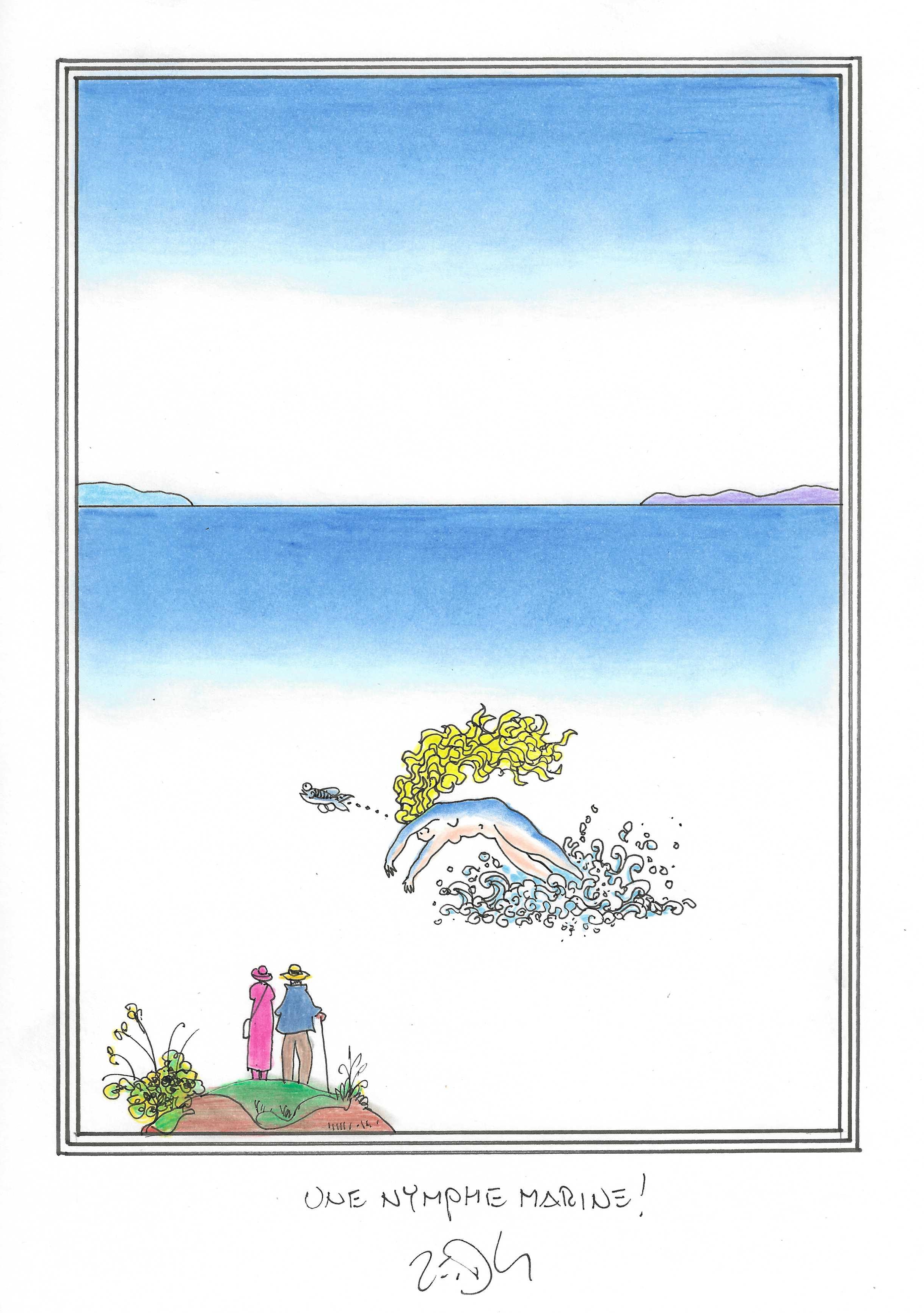Drawing of the Day – 3046 – Dessin du jour « A sea nymph ! – Une nymphe marine ! » Ink & colour on Paper – 8 x 12″ (21 x 30 cm) – Encre & couleurs sur Papier