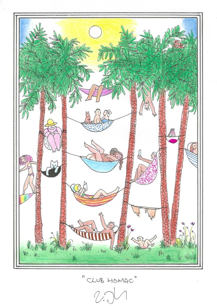 Drawing of the Day – 3654 – Dessin du jour « The hammock club – Club Hamac » Ink & colour on Paper – 8 x 12″ (21 x 30 cm) – Encre & couleurs sur Papier