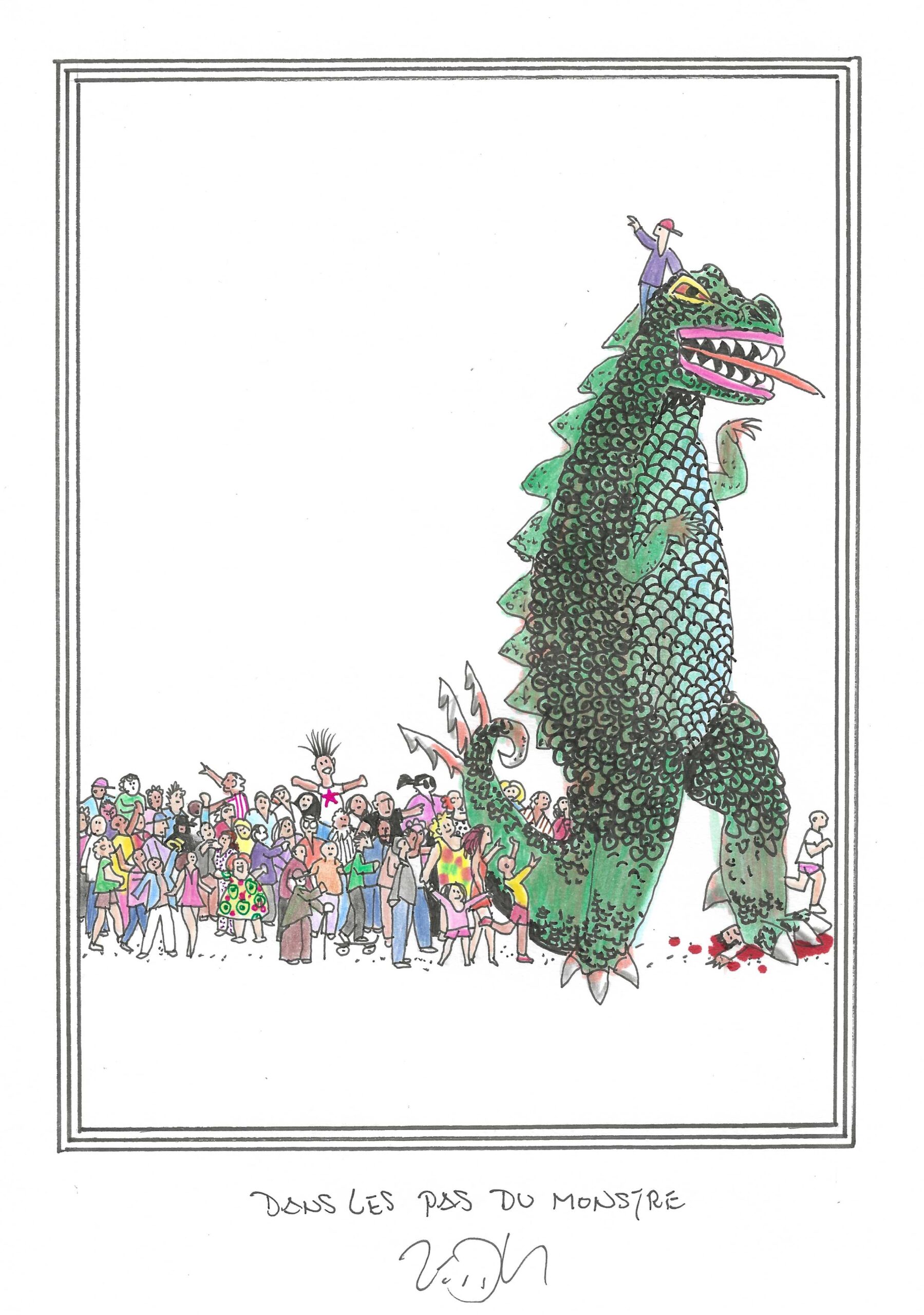 Drawing of the Day – 3655 – Dessin du jour « Following the monster – Dans les pas du monstre » Ink & colour on Paper – 8 x 12″ (21 x 30 cm) – Encre & couleurs sur Papier