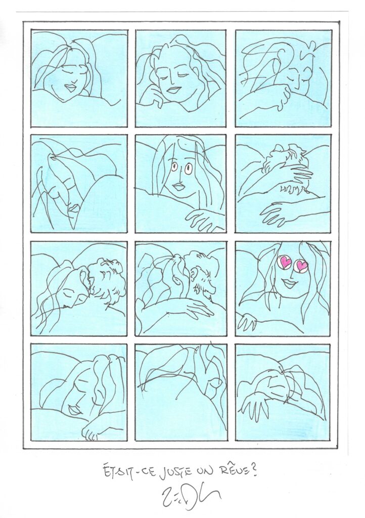 Drawing of the Day – 3656 – Dessin du jour « Was it just a dream ? – Était-ce juste un rêve ? » Ink & colour on Paper – 8 x 12″ (21 x 30 cm) – Encre & couleurs sur Papier