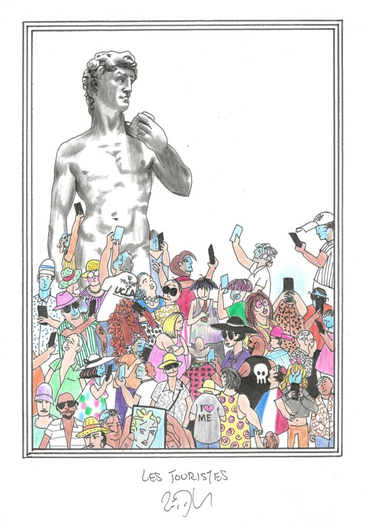 Drawing of the Day – 3657 – Dessin du jour « Tourists – Les touristes » Ink & colour on Paper – 8 x 12″ (21 x 30 cm) – Encre & couleurs sur Papier