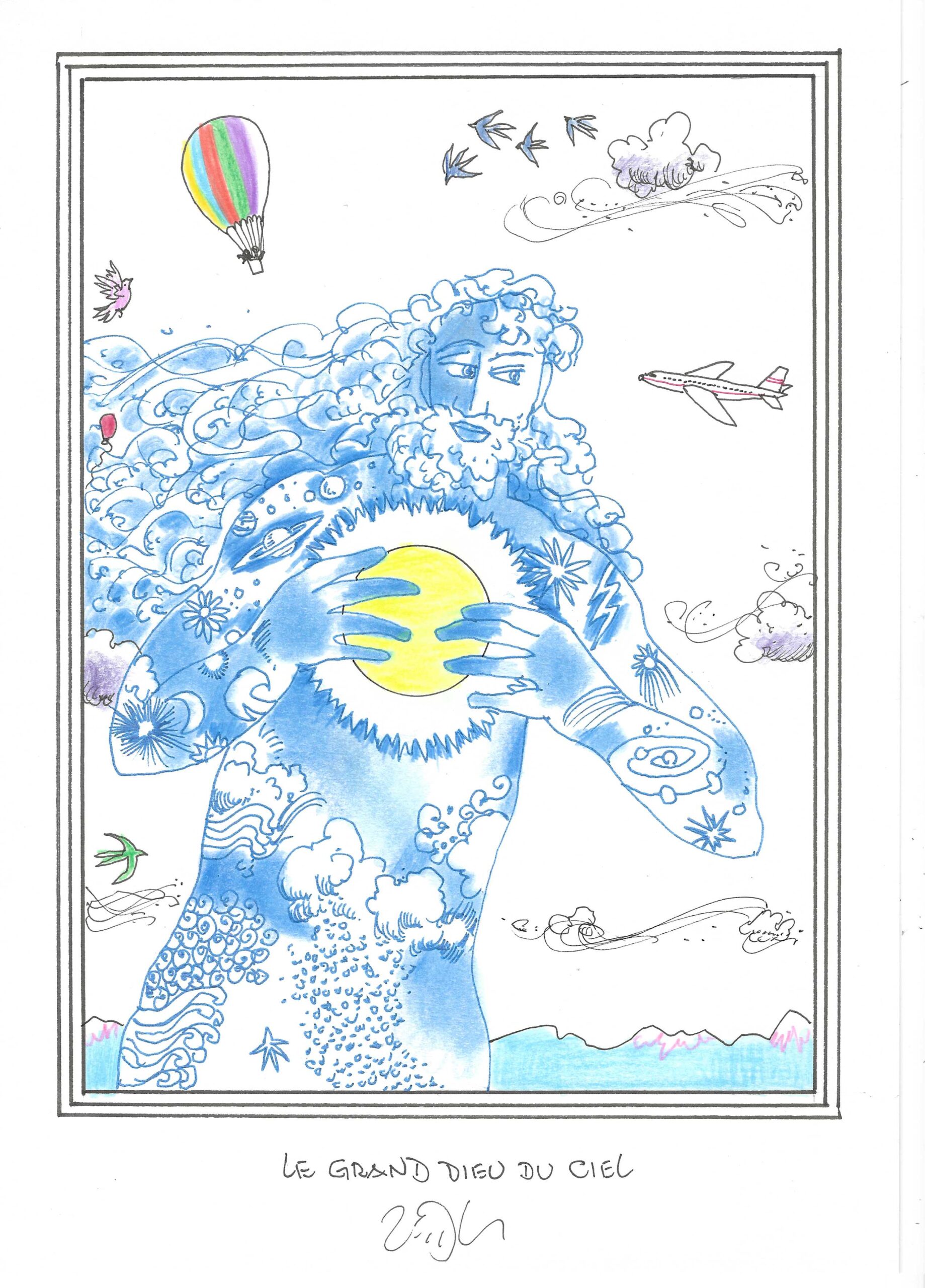 Drawing of the Day – 3658 – Dessin du jour « The great sky god – Le grand dieu du ciel » Ink & colour on Paper – 8 x 12″ (21 x 30 cm) – Encre & couleurs sur Papier