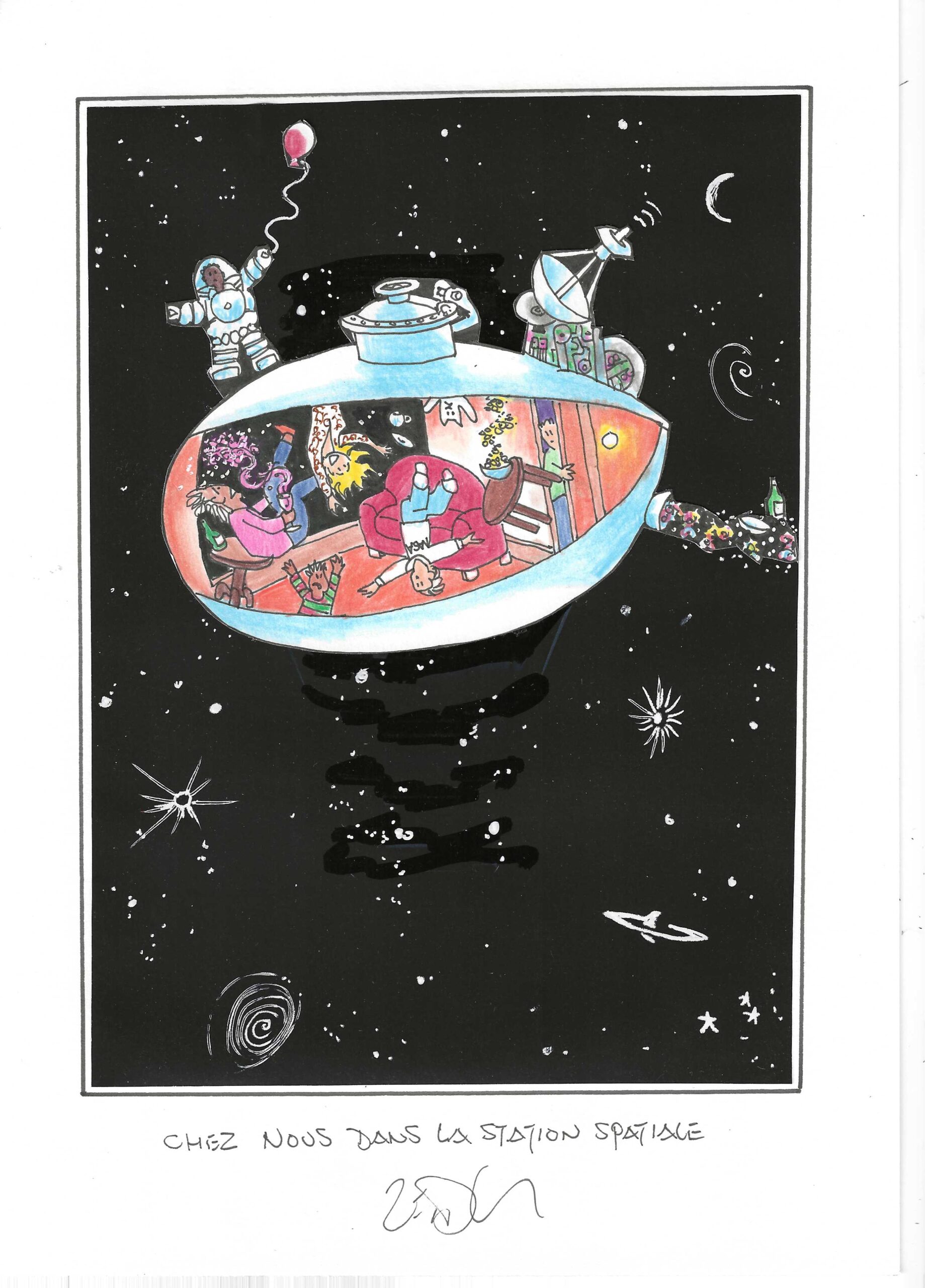 Drawing of the Day – 3659 – Dessin du jour « At home in the space station – Chez nous dans la station spatiale » Mixed Media on Paper – 8 x 12″ (21 x 30 cm) – Technique mixte sur Papier