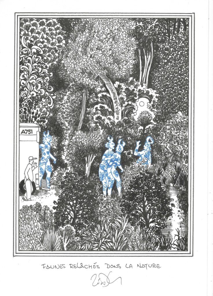 Drawing of the Day – 3660 – Dessin du jour « Fauns released into the wild – Faunes relâchés dans la nature » Ink on Paper – 8 x 12″ (21 x 30 cm) – Encre sur Papier